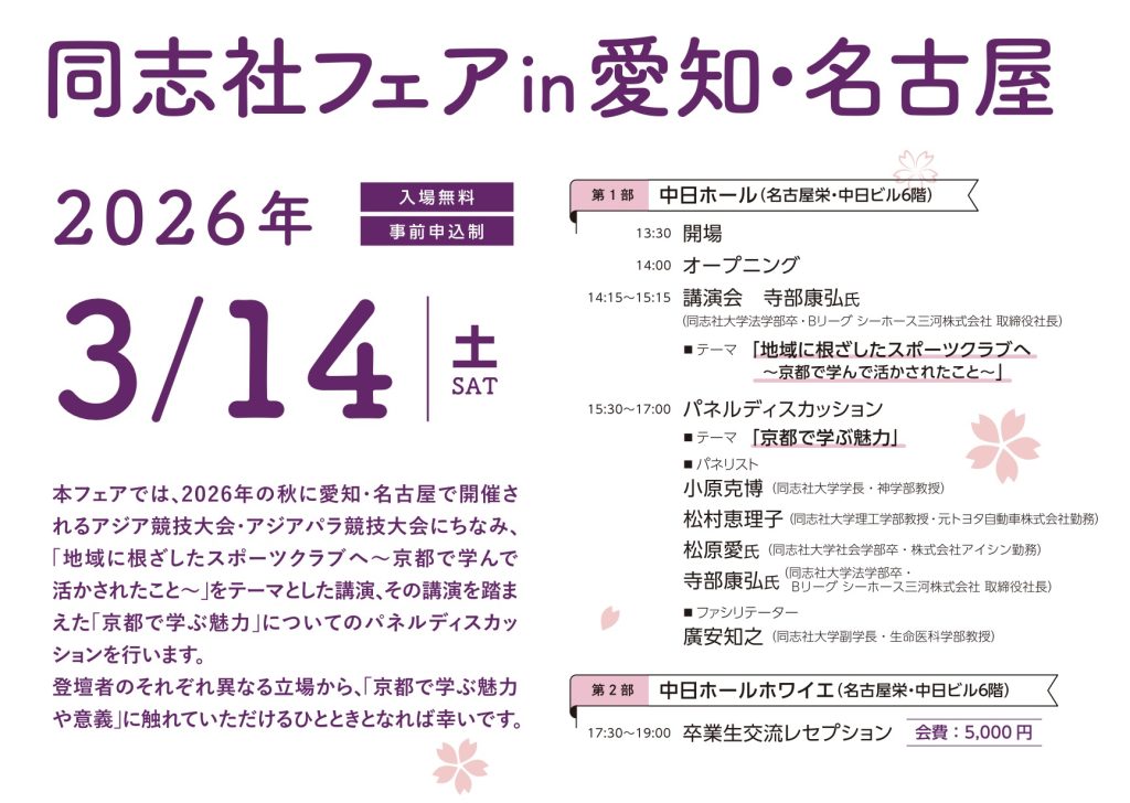 ニュース&トピックス NEWS & TOPICS 2026.01.08 校友会本部 2026年3月 同志社フェア in 愛知・名古屋 2025.07.17 校友会本部 2025年ホームカミングデー&大懇親会 2025.07.07 校友会本部 2025年度「リユニオン全同志社人ゴルフ大会」開催のご案内 2025.06.23 校友会本部 Doshisha Day~若手卒業生の集い~ 2025.06.23 校友会本部 2025年度定時評議員会開催のご報告 2025.01.29 校友会本部 <終了御礼>2025年3月【同志社フェア in 福井】 一覧はこちら