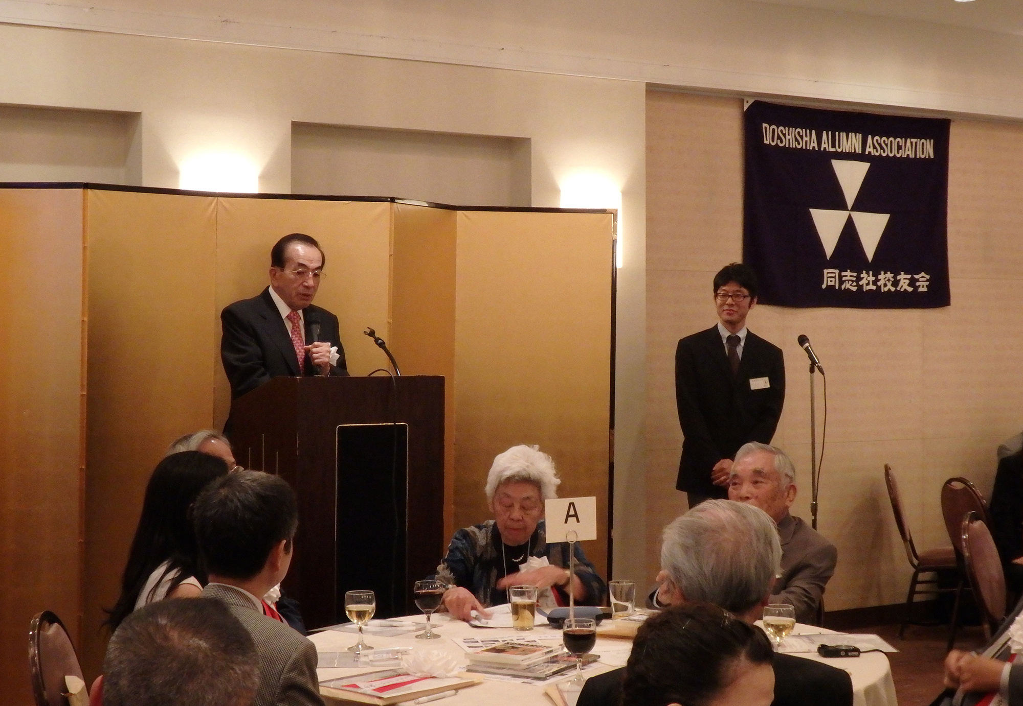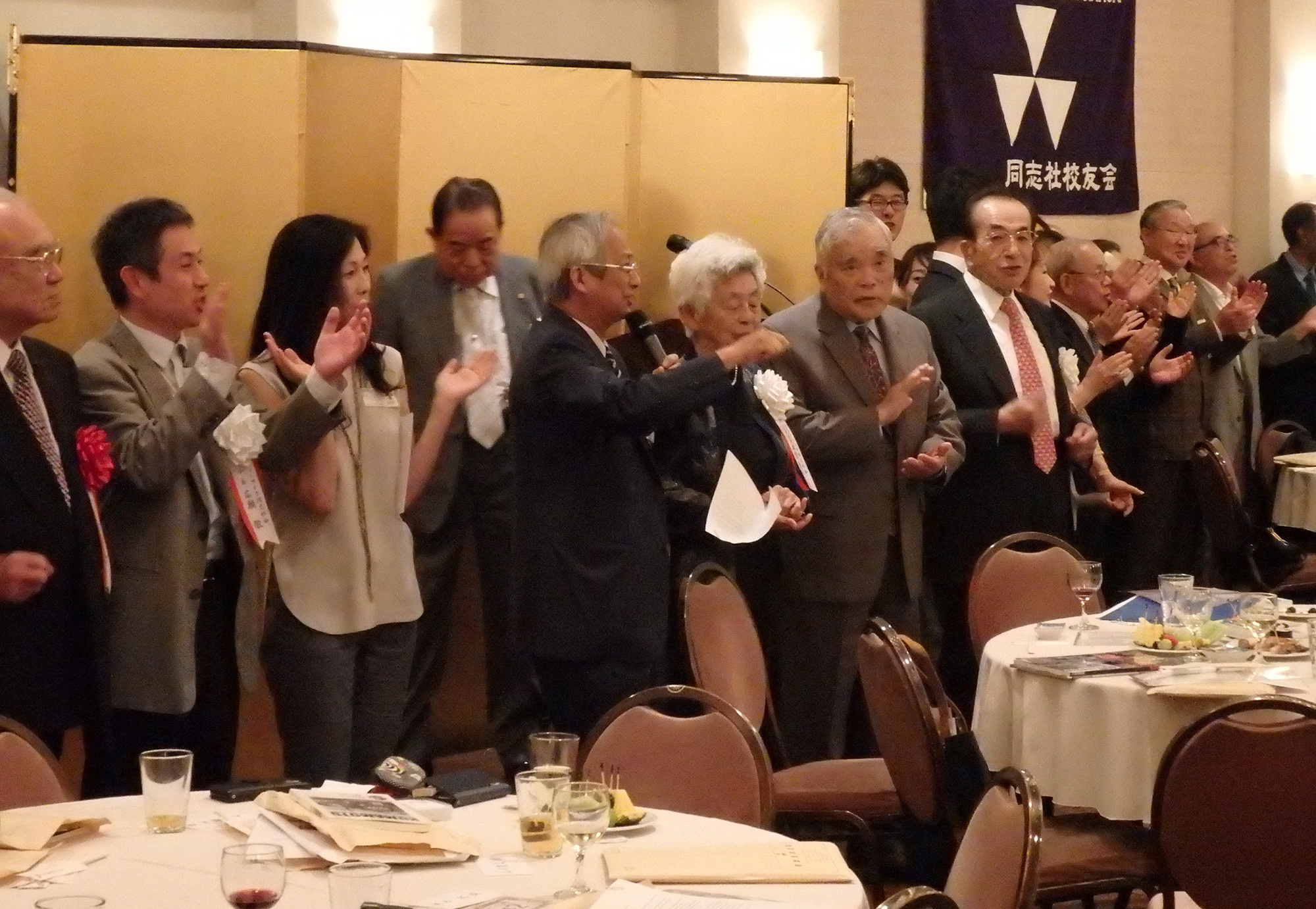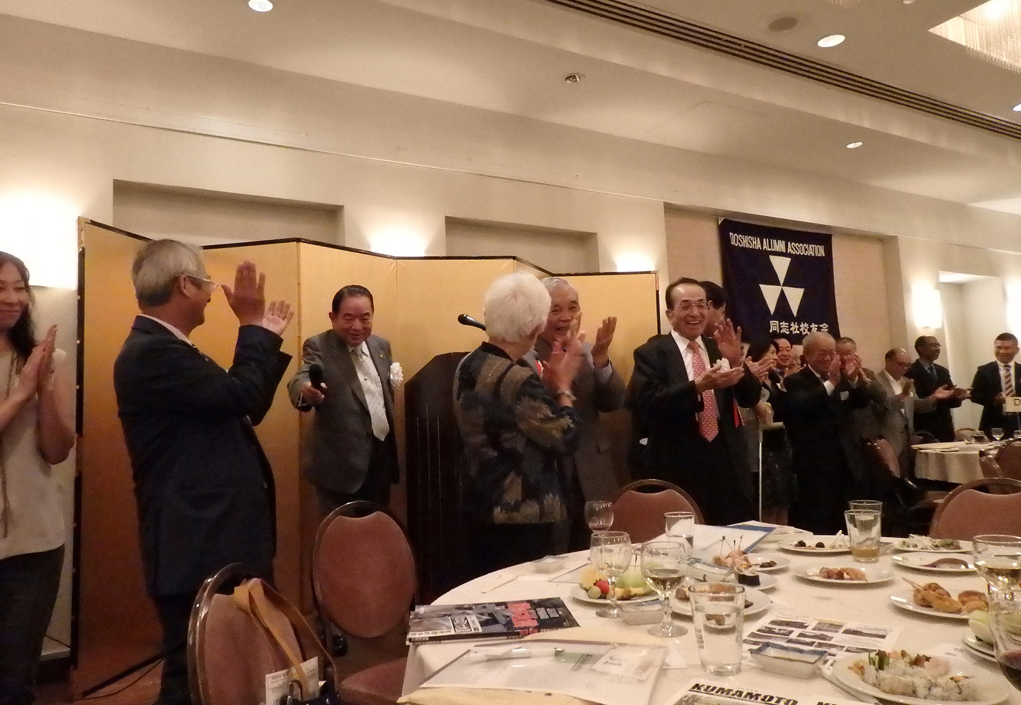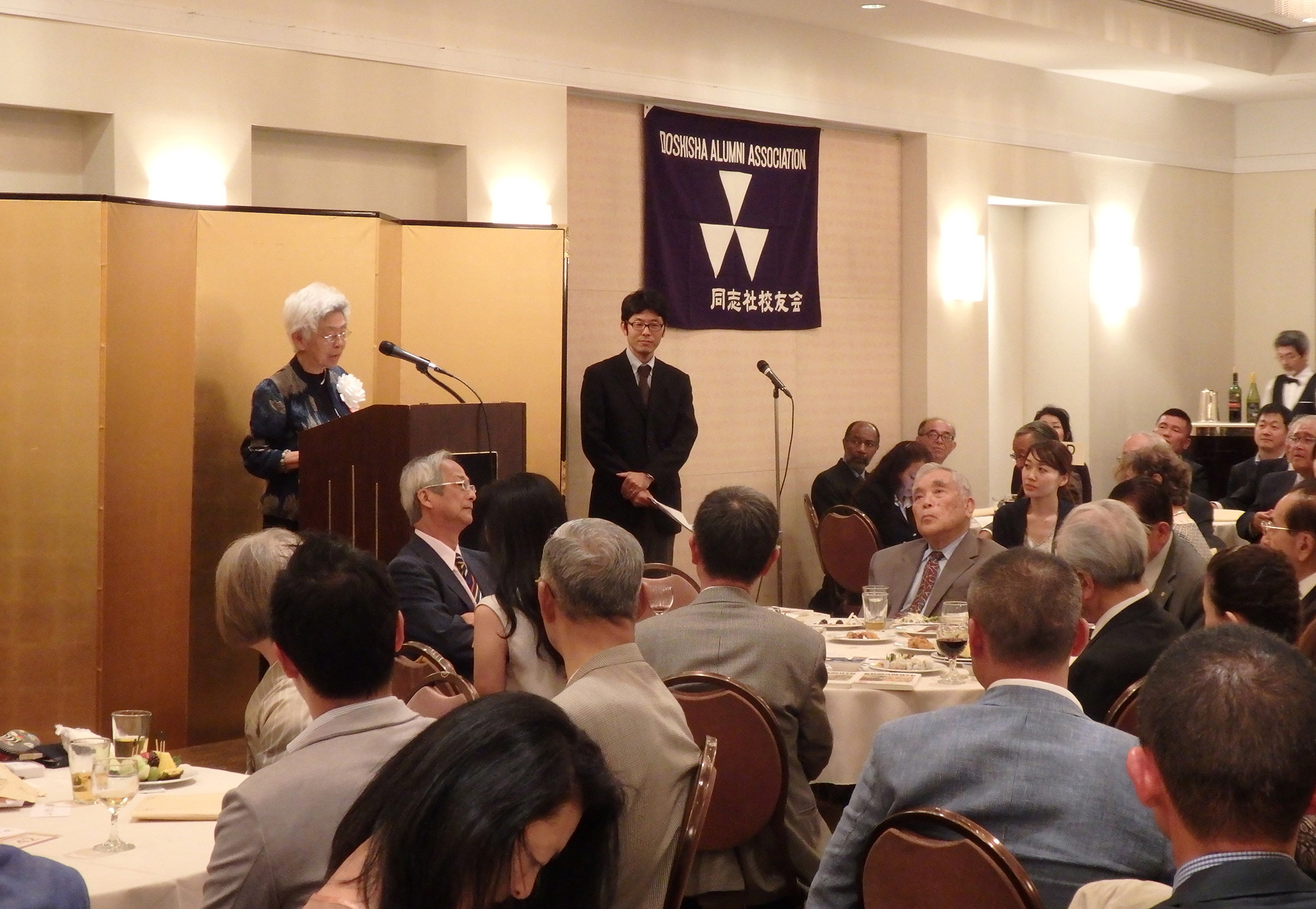 閉会の挨拶には、第11代目の同志社総長牧野虎次氏のお孫さんに当たる、ニューヨーク同志社会本間名誉会長が登壇しこの素晴らしい会の開催に対し賛辞を述べ、同志社創立者新島先生の直弟子で大変な感化を受け、小新島になるのだと心に決めておられた祖父、牧野先生のエピソードと、本間名誉会長のご主人の立夫氏の祖父、本間俊平氏が受刑者の社会復帰活動をされていた際、キリスト教の学校である同志社に大変な圧力がかかったとき守ってくれたエピソードの紹介があり、このような歴史の中で、若き日に同志社で学んだ人生観や、その過程で出会った方たちとの強い絆が豊かな人生形成の糧となったと語られました。この日のNYでの同志社校友の一大懇親会はその証であり、感謝の意を表され、母校のためにこの国際的な経験を生かして、卒業生全員が貢献することを願っていると結ばれました。