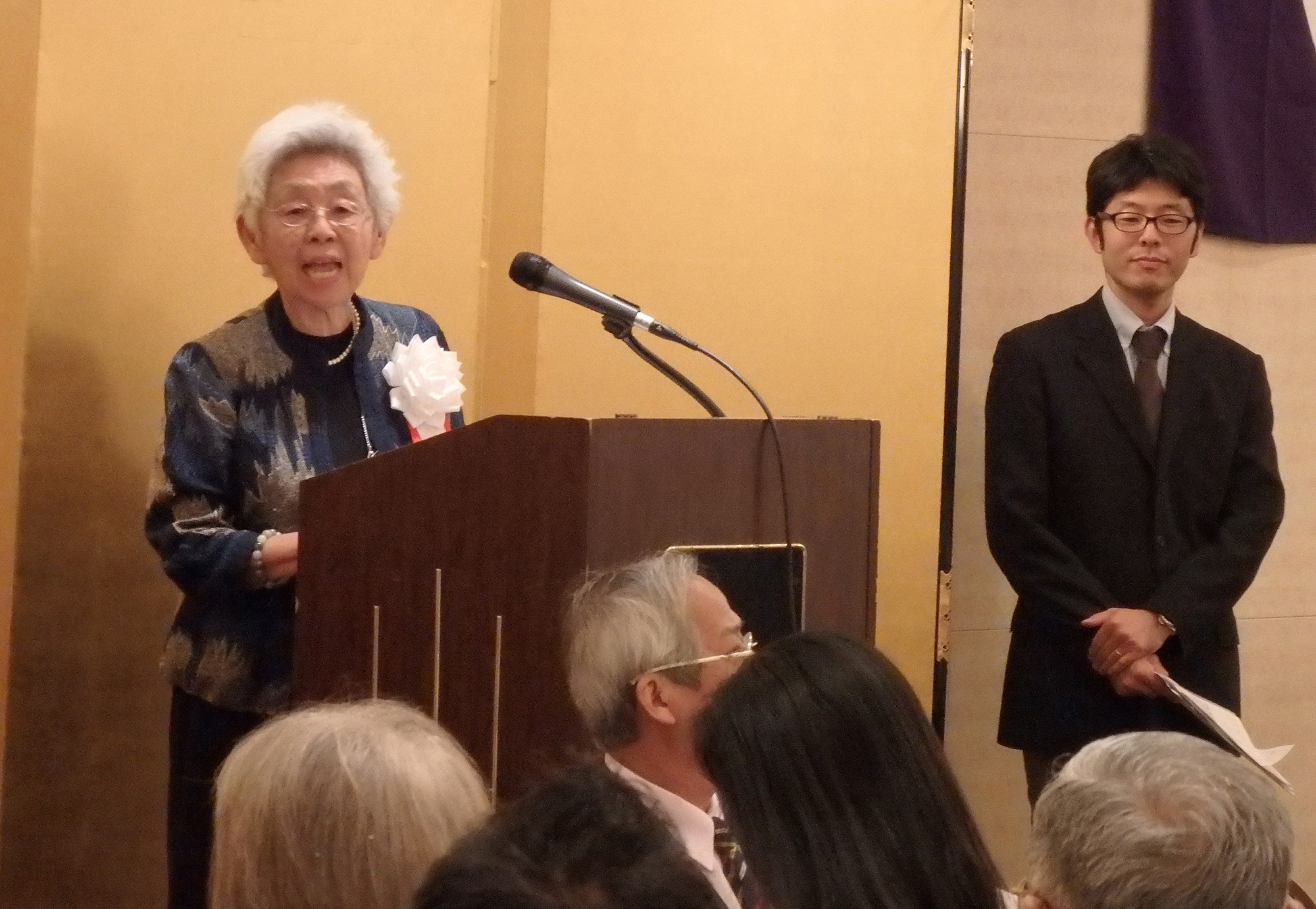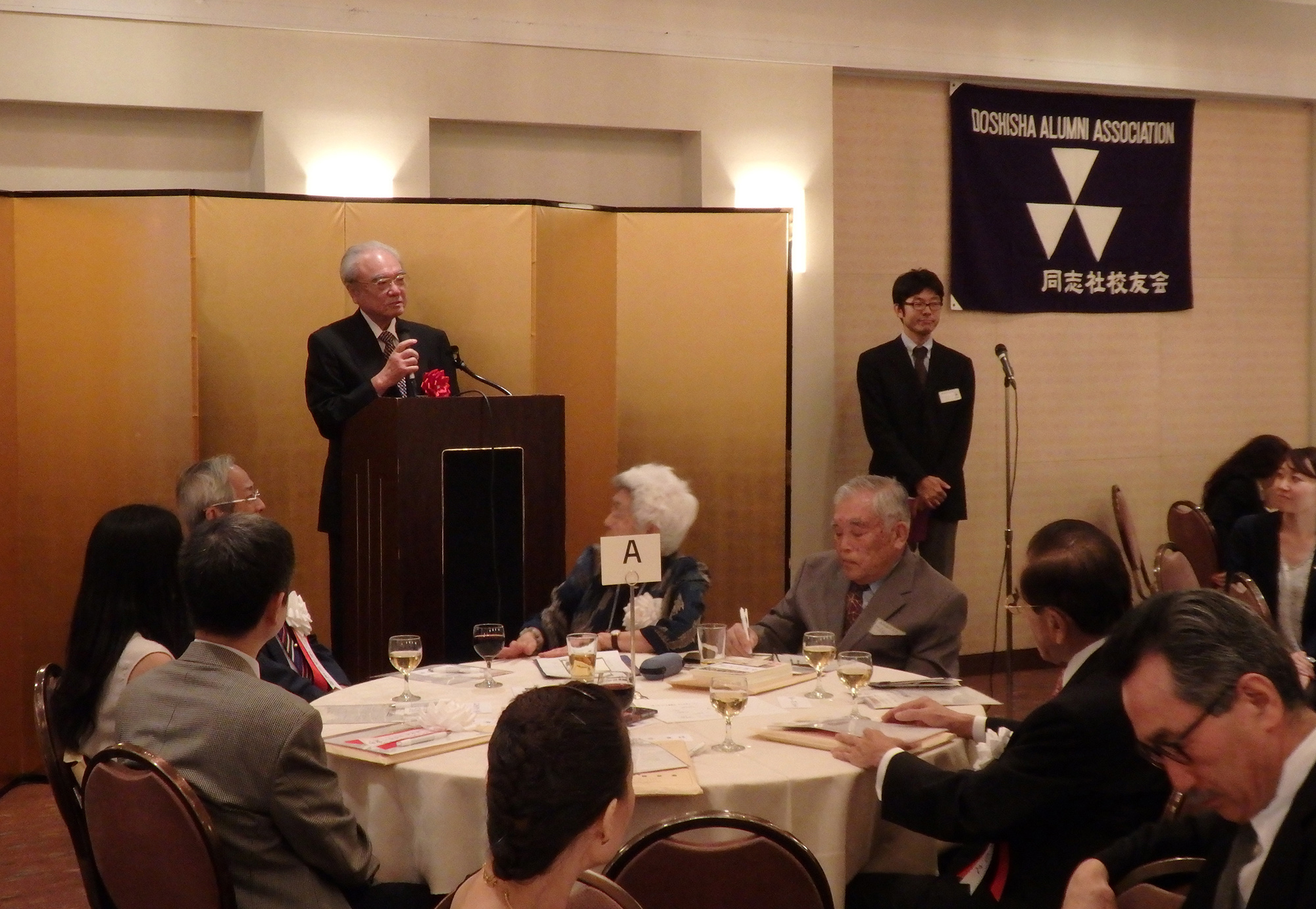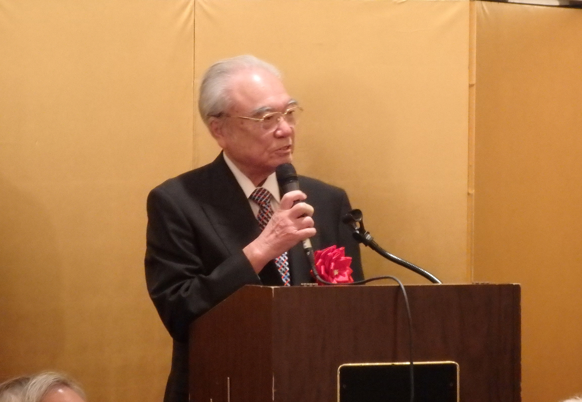 閉会の挨拶には、第11代目の同志社総長牧野虎次氏のお孫さんに当たる、ニューヨーク同志社会本間名誉会長が登壇しこの素晴らしい会の開催に対し賛辞を述べ、同志社創立者新島先生の直弟子で大変な感化を受け、小新島になるのだと心に決めておられた祖父、牧野先生のエピソードと、本間名誉会長のご主人の立夫氏の祖父、本間俊平氏が受刑者の社会復帰活動をされていた際、キリスト教の学校である同志社に大変な圧力がかかったとき守ってくれたエピソードの紹介があり、このような歴史の中で、若き日に同志社で学んだ人生観や、その過程で出会った方たちとの強い絆が豊かな人生形成の糧となったと語られました。この日のNYでの同志社校友の一大懇親会はその証であり、感謝の意を表され、母校のためにこの国際的な経験を生かして、卒業生全員が貢献することを願っていると結ばれました。