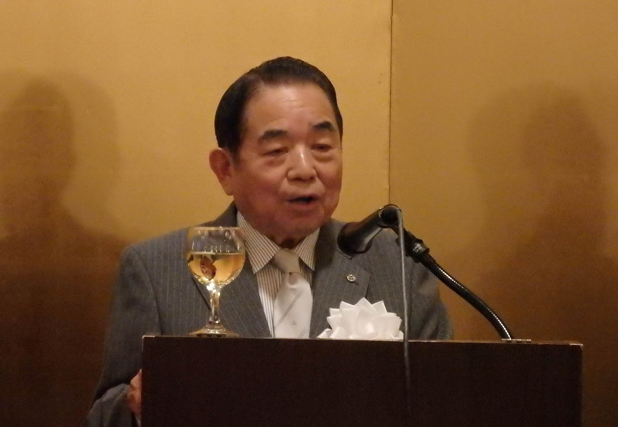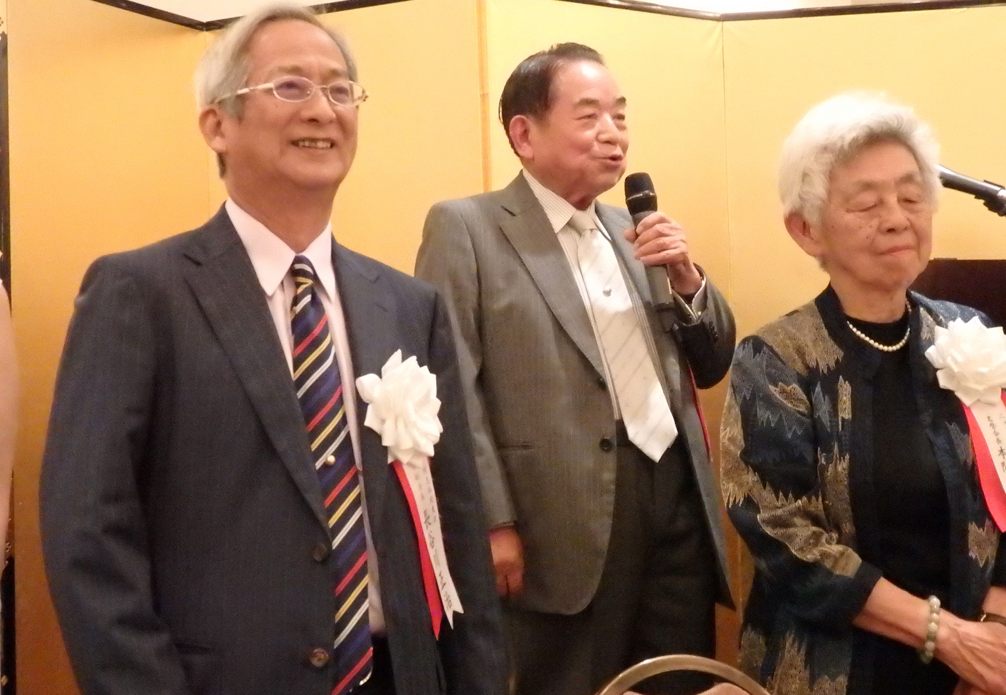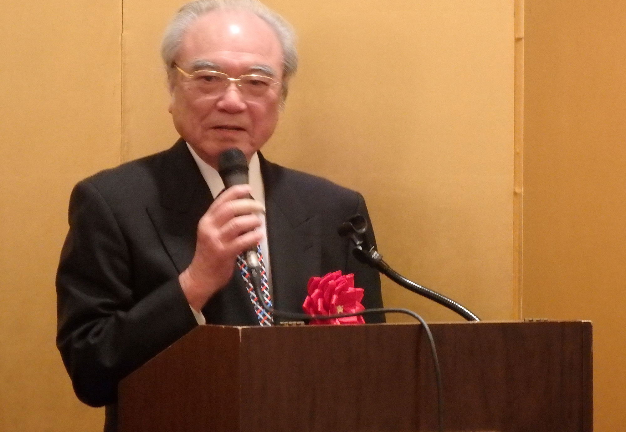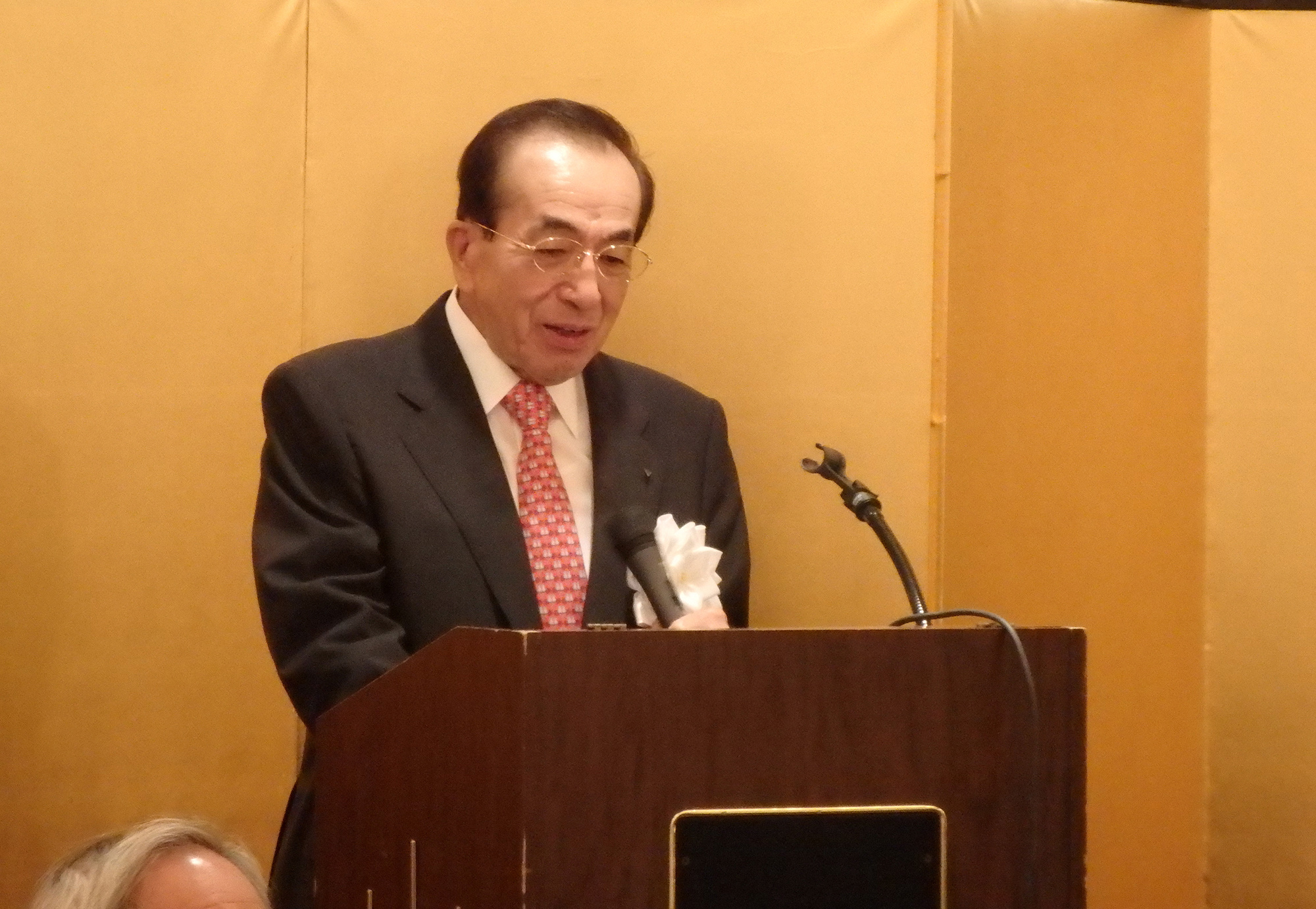 閉会の挨拶には、第11代目の同志社総長牧野虎次氏のお孫さんに当たる、ニューヨーク同志社会本間名誉会長が登壇しこの素晴らしい会の開催に対し賛辞を述べ、同志社創立者新島先生の直弟子で大変な感化を受け、小新島になるのだと心に決めておられた祖父、牧野先生のエピソードと、本間名誉会長のご主人の立夫氏の祖父、本間俊平氏が受刑者の社会復帰活動をされていた際、キリスト教の学校である同志社に大変な圧力がかかったとき守ってくれたエピソードの紹介があり、このような歴史の中で、若き日に同志社で学んだ人生観や、その過程で出会った方たちとの強い絆が豊かな人生形成の糧となったと語られました。この日のNYでの同志社校友の一大懇親会はその証であり、感謝の意を表され、母校のためにこの国際的な経験を生かして、卒業生全員が貢献することを願っていると結ばれました。