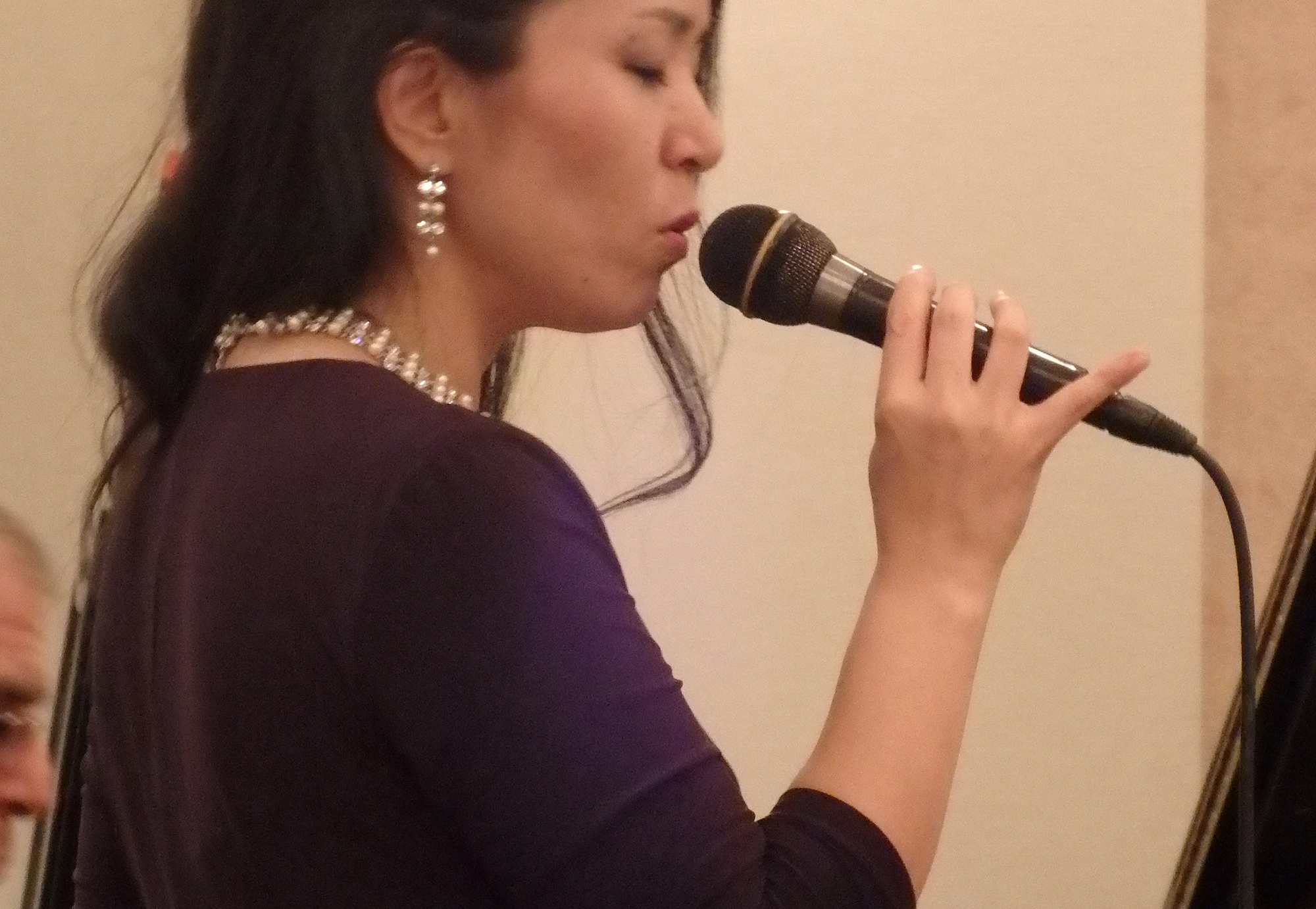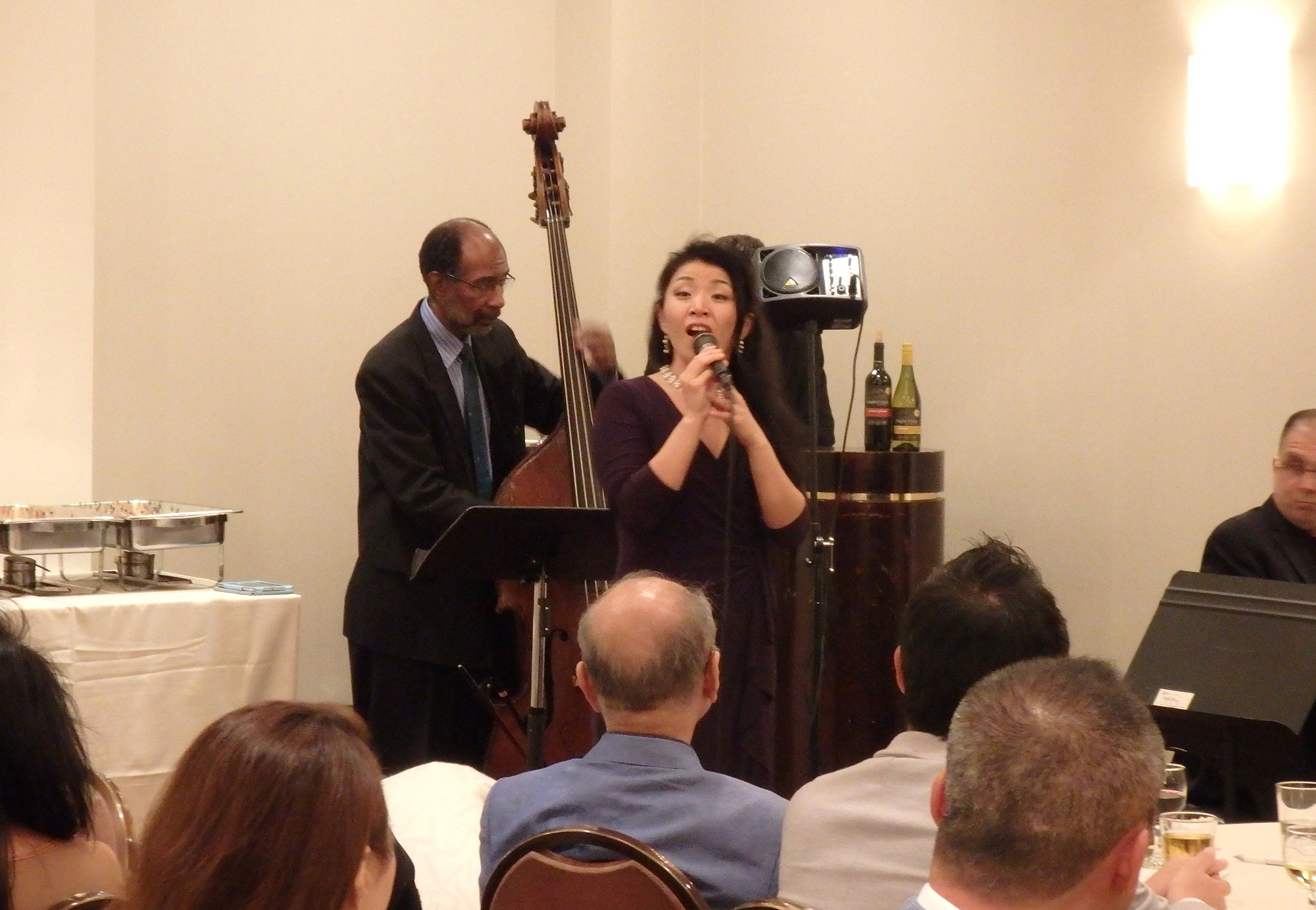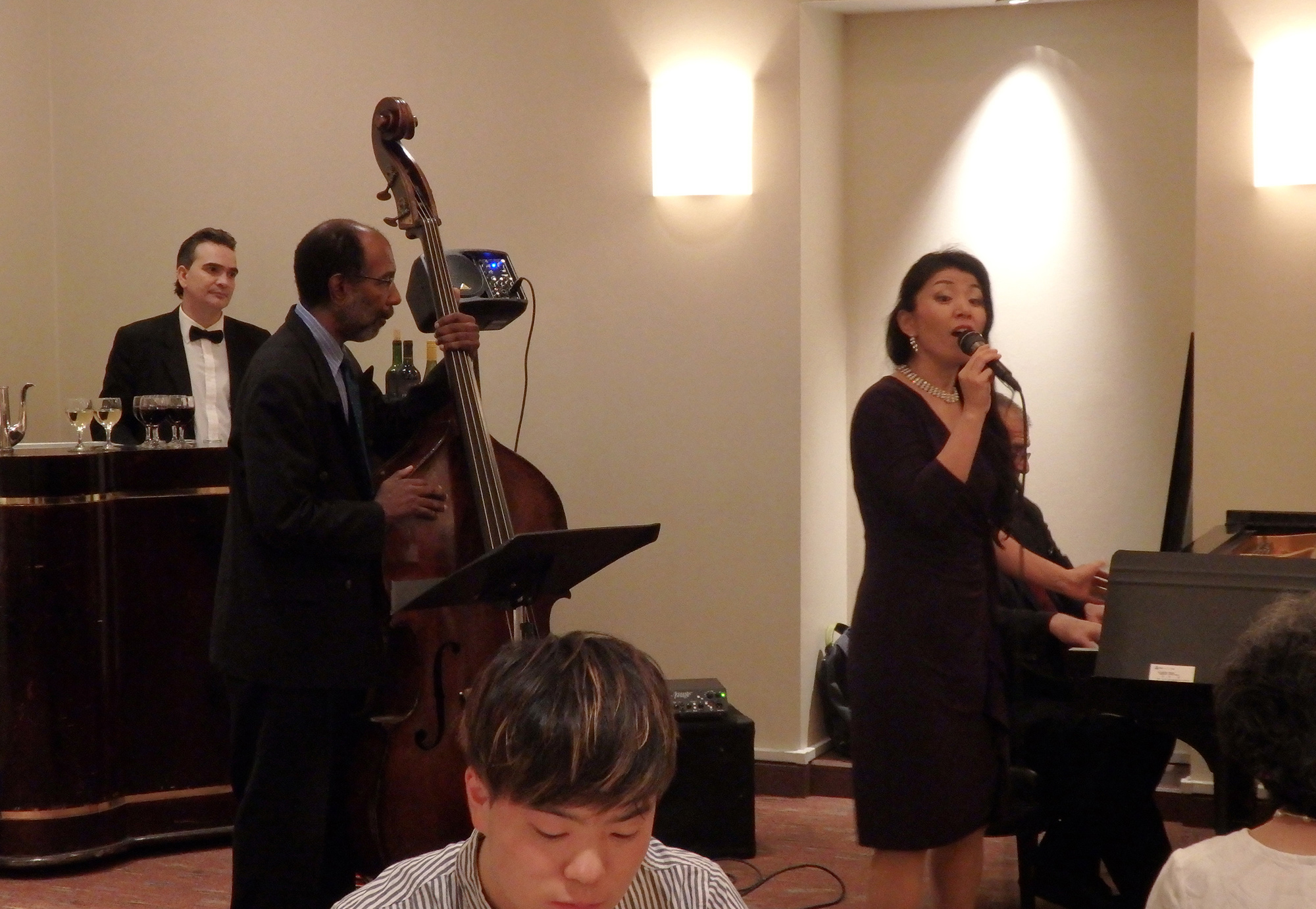 中村校友会副会長からの、「第一回校友会海外大懇親会をニューヨークで開催できることは望外の喜びです。母国を離れ切磋琢磨されている交友と共に、古きよき日に同志社で培われた友情の絆をかため、母校の将来の発展のために乾杯!」と乾杯発声で交流会が開会し、国際色豊かな懇親場面となりました。卒業生深尾さんによるジャズコンサート、そしてお楽しみのDoshisha Lottery、同志社オリジナルグッズ賞品の他に、特別賞として中村副会長から同志社の徽章がデザインされたオリジナルパークアクセサリー2点、更に会長賞としてダイキンエ業社製空気清浄機を3台が用意され、当選した皆様は大変な喜びようでした。