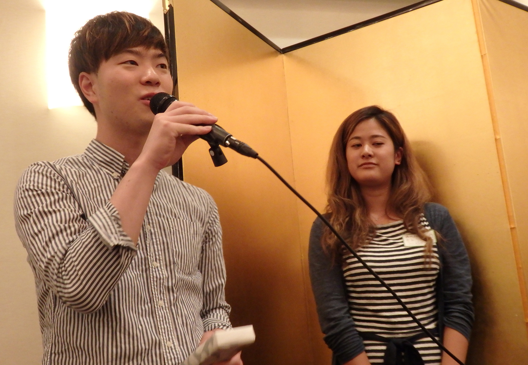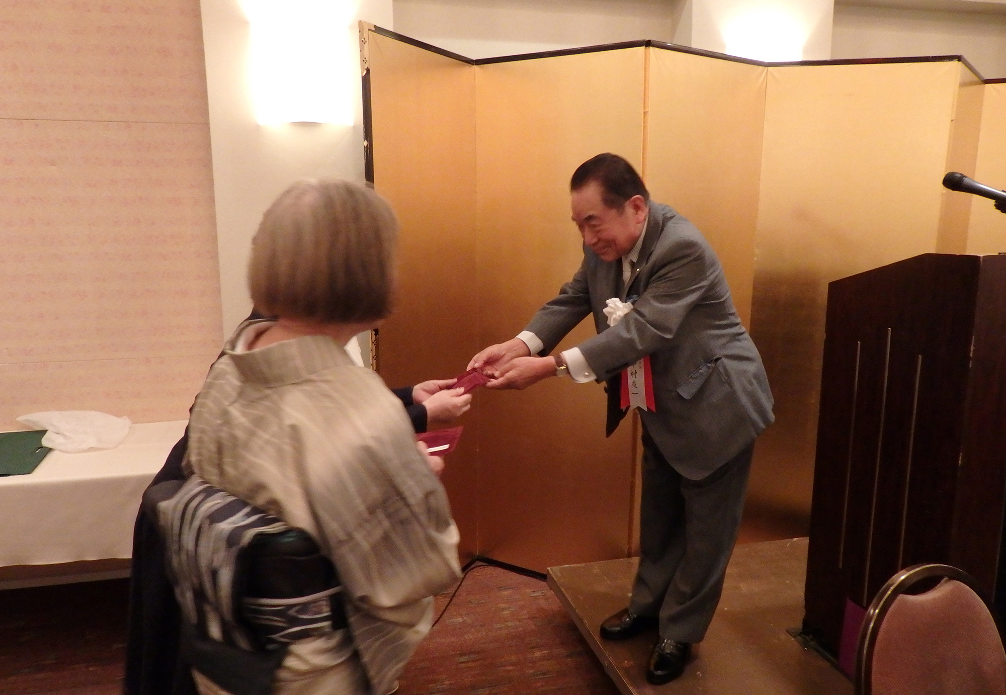 今回福引のお手伝いをしていただいた現役学生2名、ロサンジェルス留学生の奥村真衣さんとトロントから駆け付けてくれた桑原周也君に感謝の意味を込めて、長谷川副会長より記念品をプレゼント。未来の校友会員ヘエールを送りました。奥村さんと桑原君からはいろんな先輩と話ができ、改めて同志社に入学した事の喜びを噛み締め、皆さんに感謝の気持ちを精一杯伝えていました。