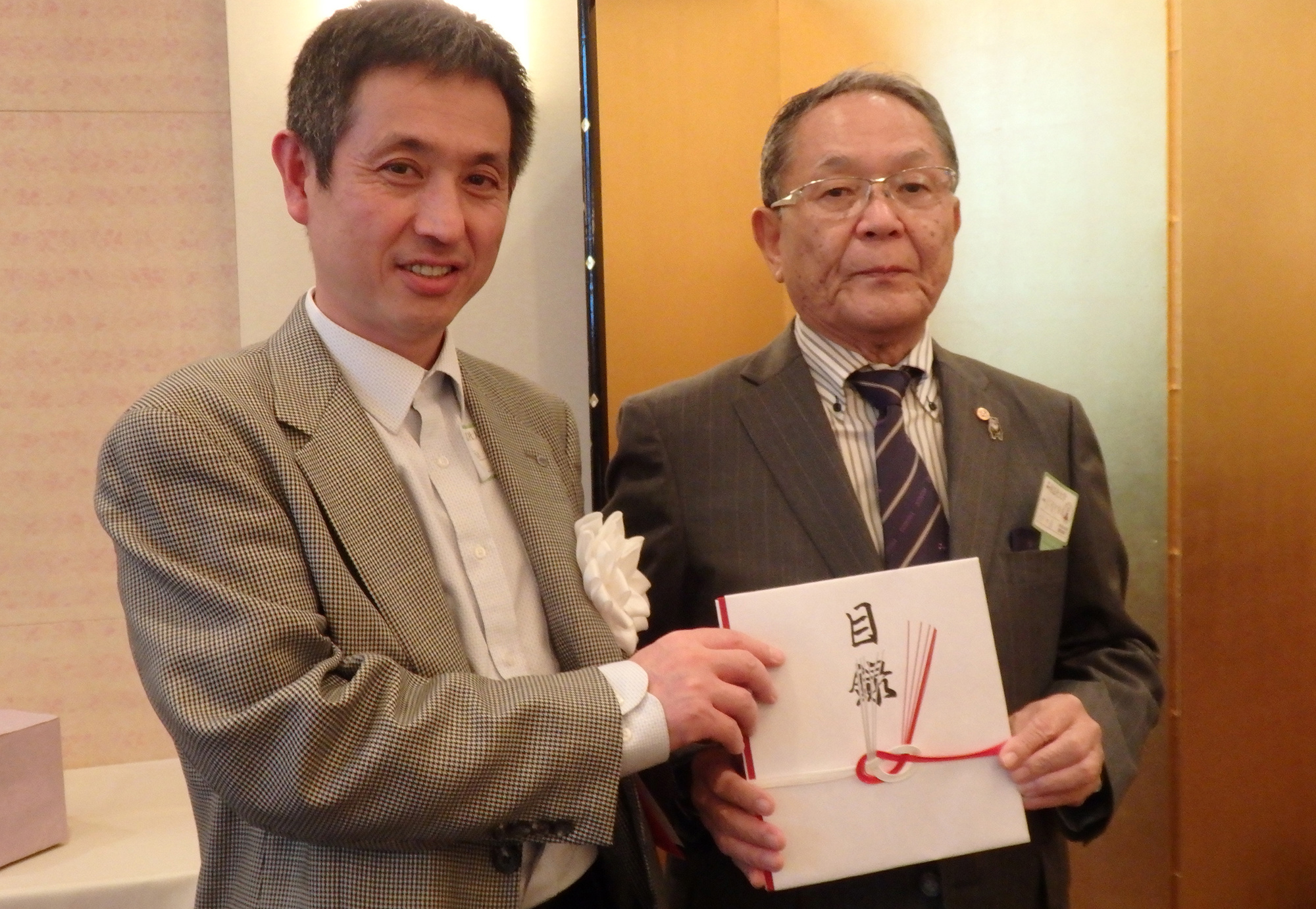 会も終わりに近づき、日本から参加の木下熊本県支部長から熊本地震で倒壊したジェーンズ邸をはじめとした被災の現状報告のあと募金を呼び掛けたところ、約1000ドルが集まり、広瀬ニューヨーク同志社会会長より手渡されました。