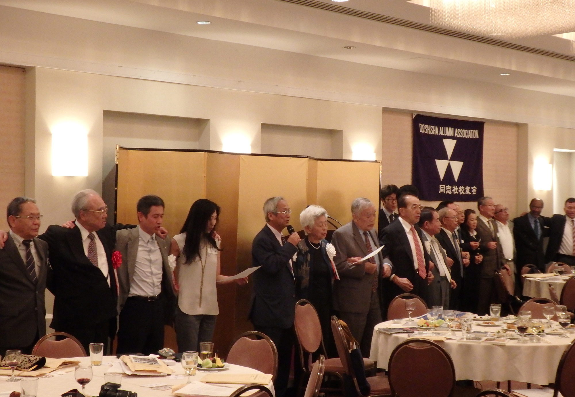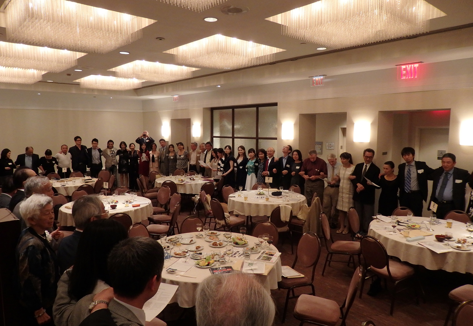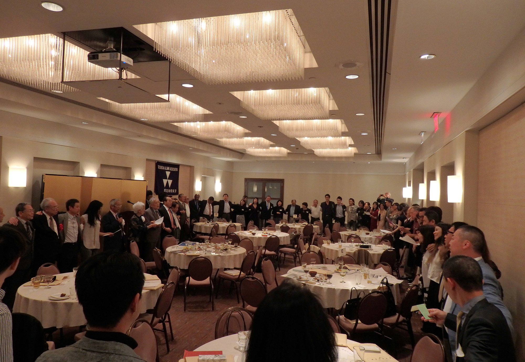 最後に長谷川副会長のリードで参加者全員が肩を組み、Doshisha College Song を歌い、同志社チアを声高らかに再会を約し、中村副会長による英語のクロージングで解散となったものの一同去り難く、会場のあちこちで話の輪が解けぬまま、約1時間オーバーしてもなお、漸く余韻を惜しむかの如く三々五々、賑やかな夜のニューヨークの町へと散会していきました。