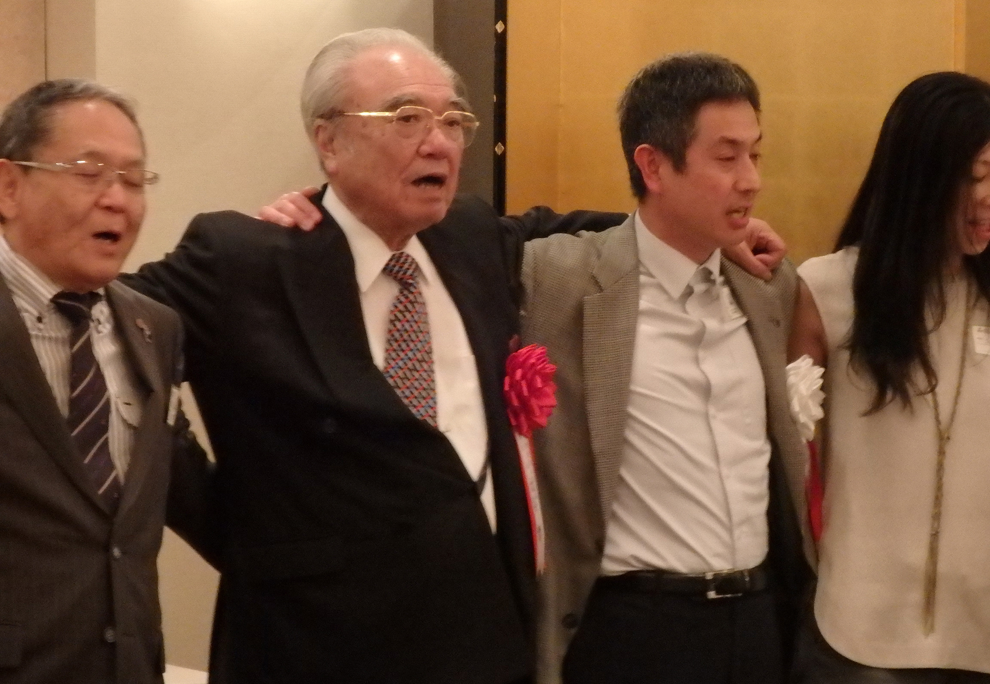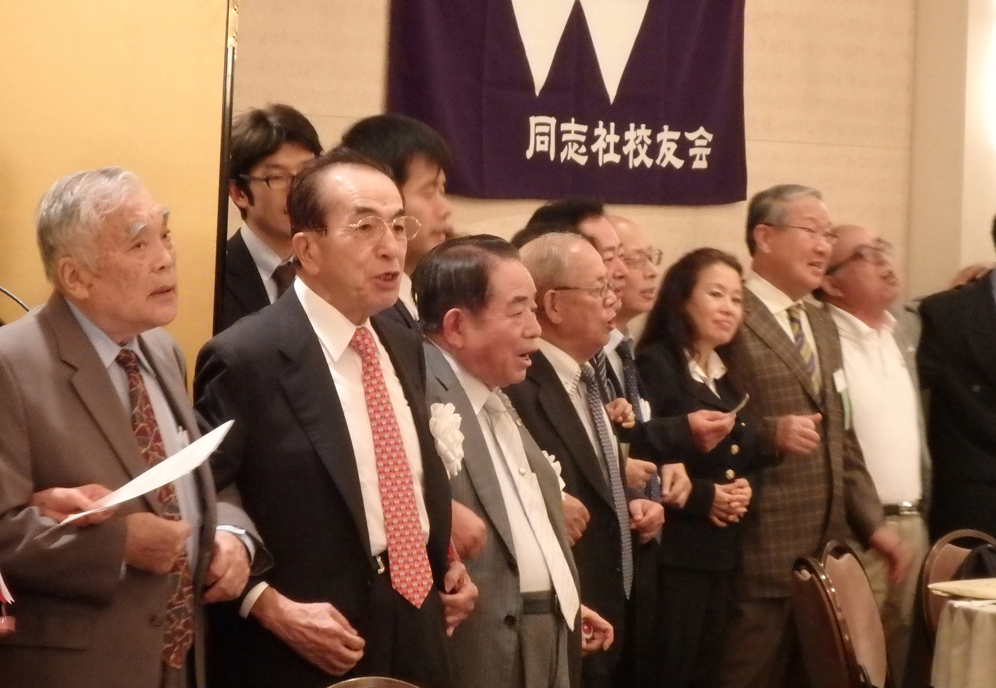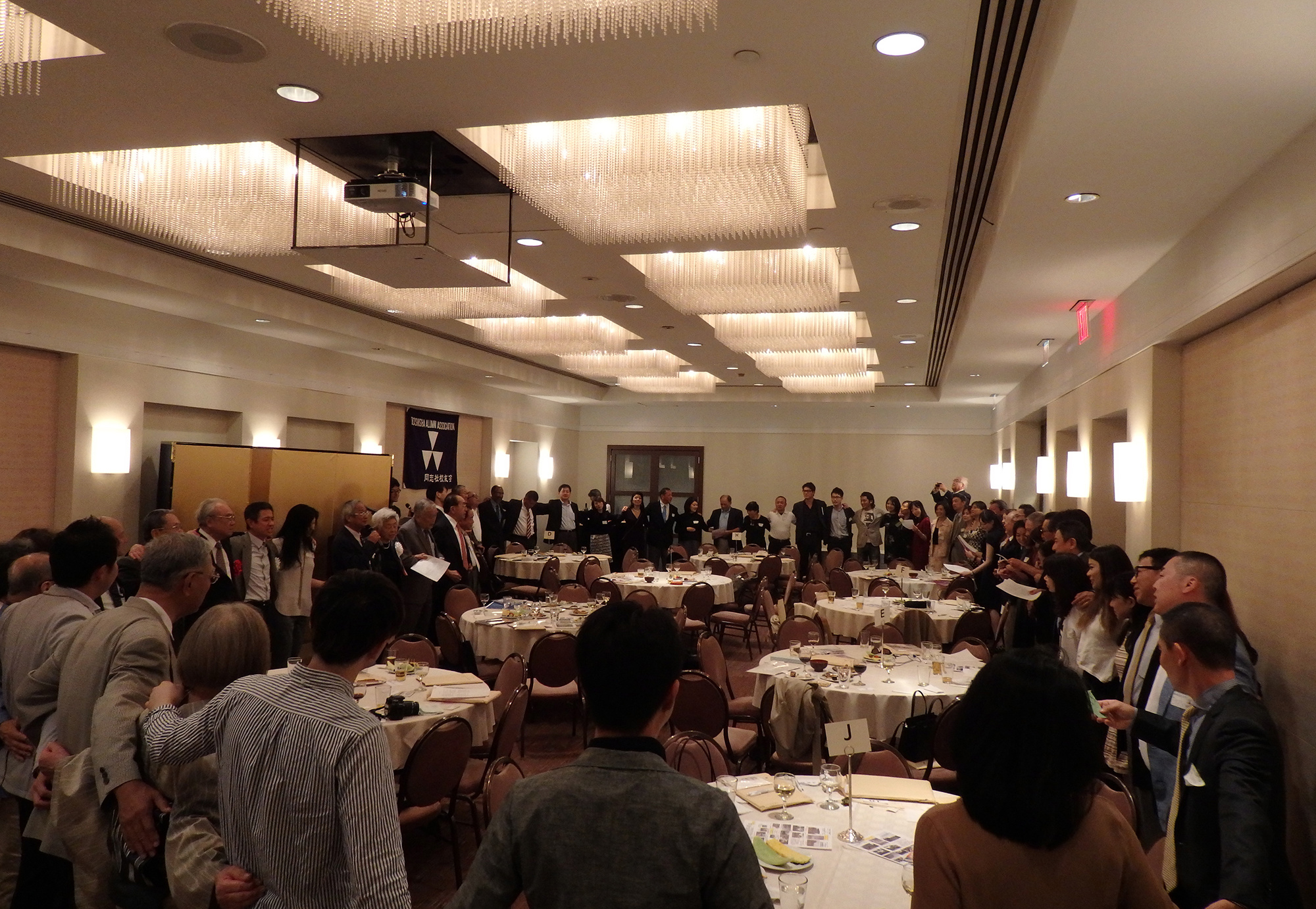 最後に長谷川副会長のリードで参加者全員が肩を組み、Doshisha College Song を歌い、同志社チアを声高らかに再会を約し、中村副会長による英語のクロージングで解散となったものの一同去り難く、会場のあちこちで話の輪が解けぬまま、約1時間オーバーしてもなお、漸く余韻を惜しむかの如く三々五々、賑やかな夜のニューヨークの町へと散会していきました。