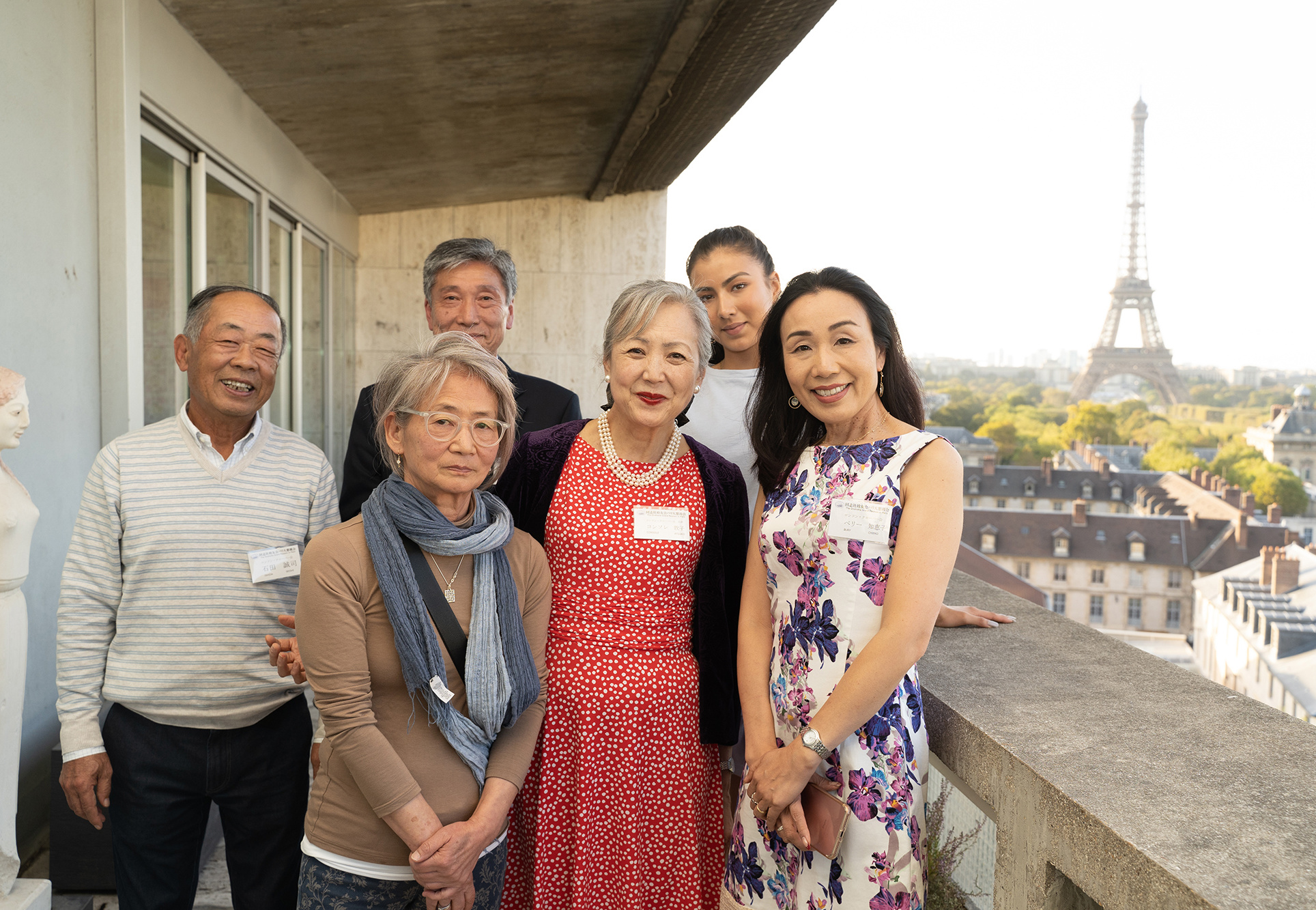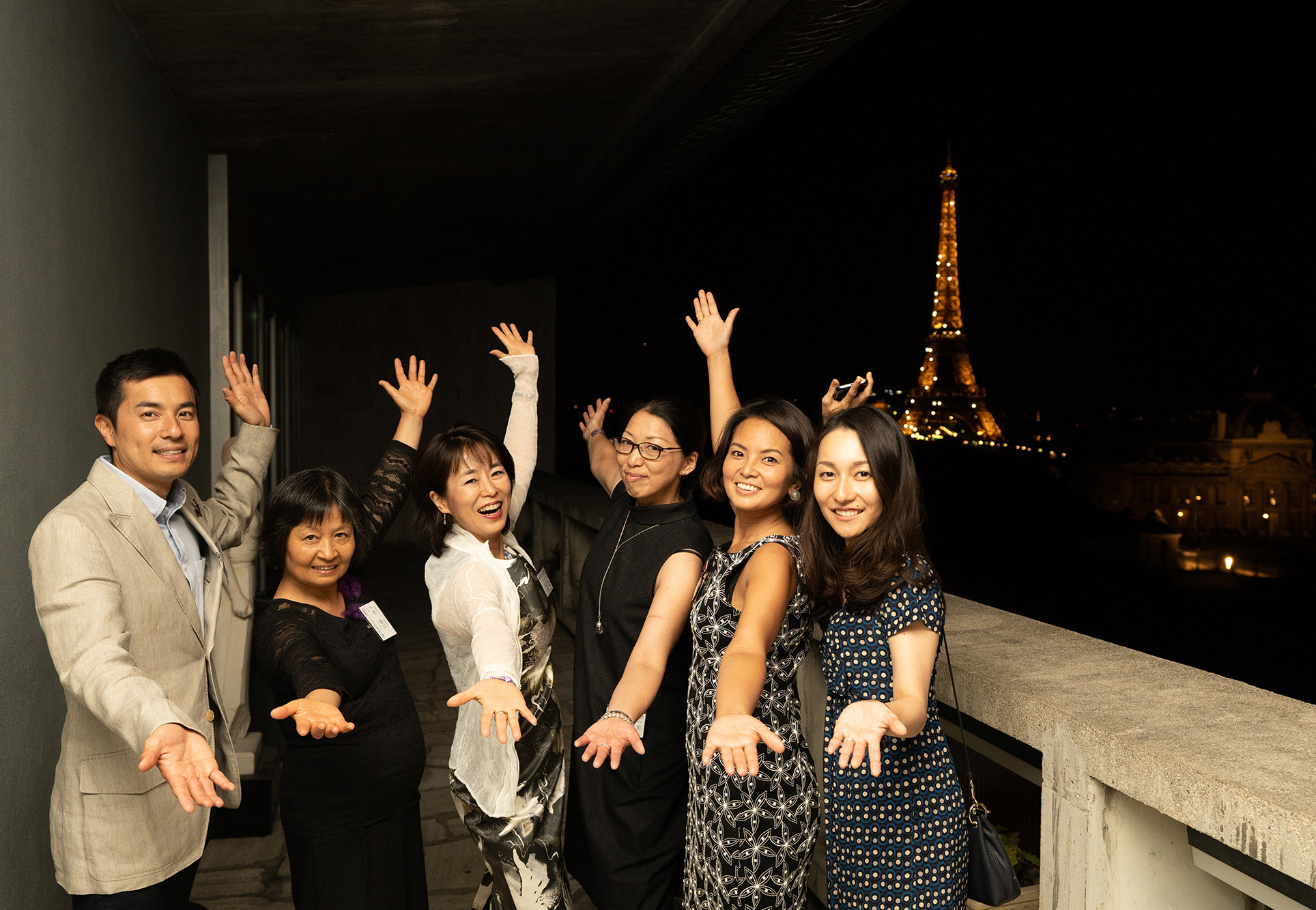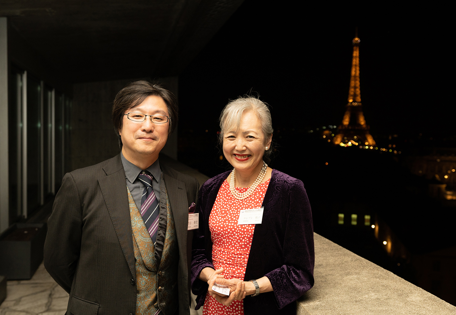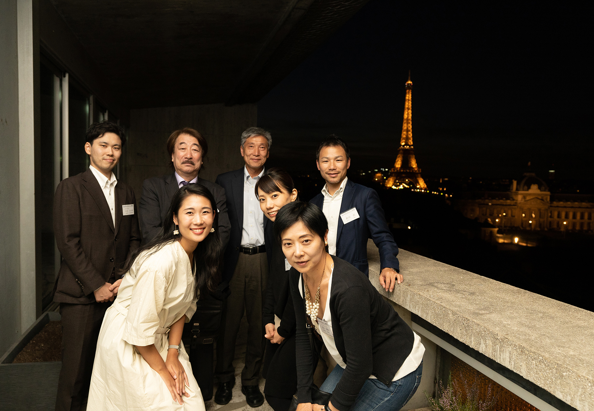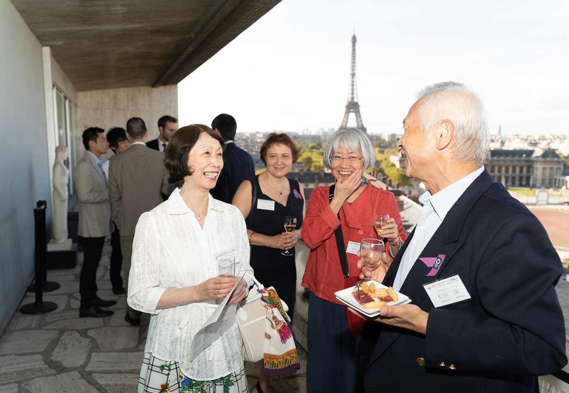 受付を済まされた方は、同志社スペイン会がプロデュースした「ハモン・イベリコ」生ハムにスパークリングワインで、開会までの時間を過ごされました。会場のバルコニーからはエッフェル塔が望める絶好のロケーションで、プロのカメラマンが記念写真の撮影サービス。そしていよいよ開会。