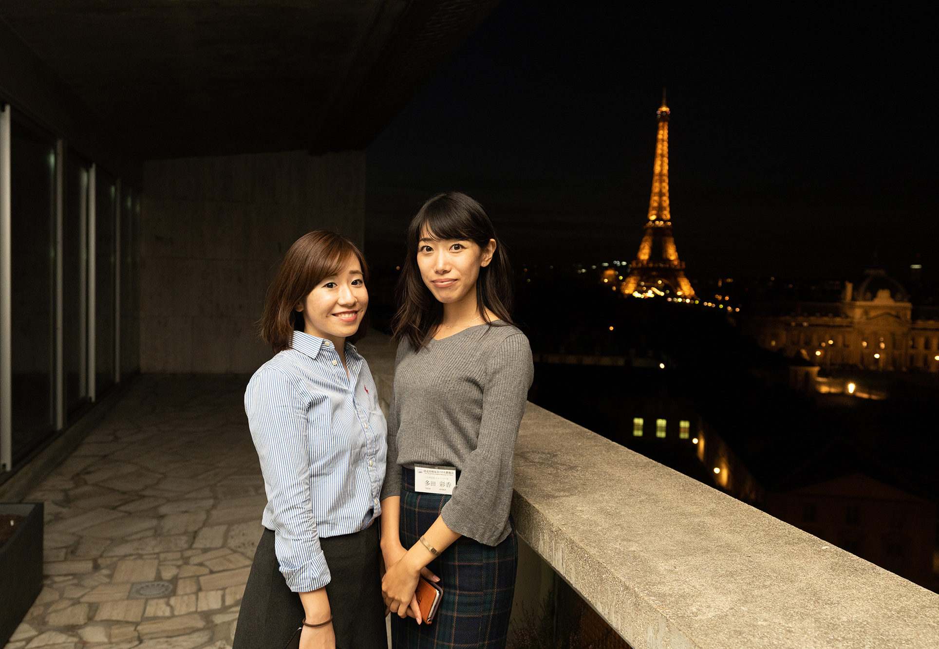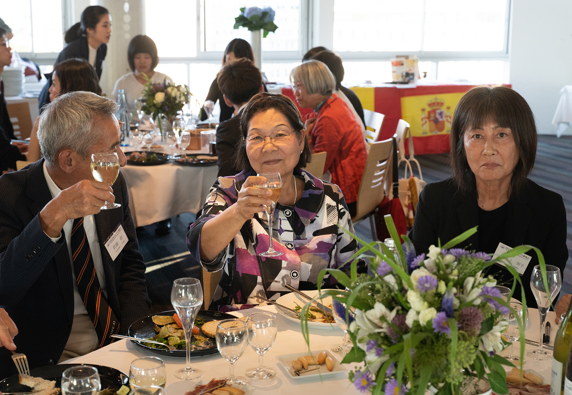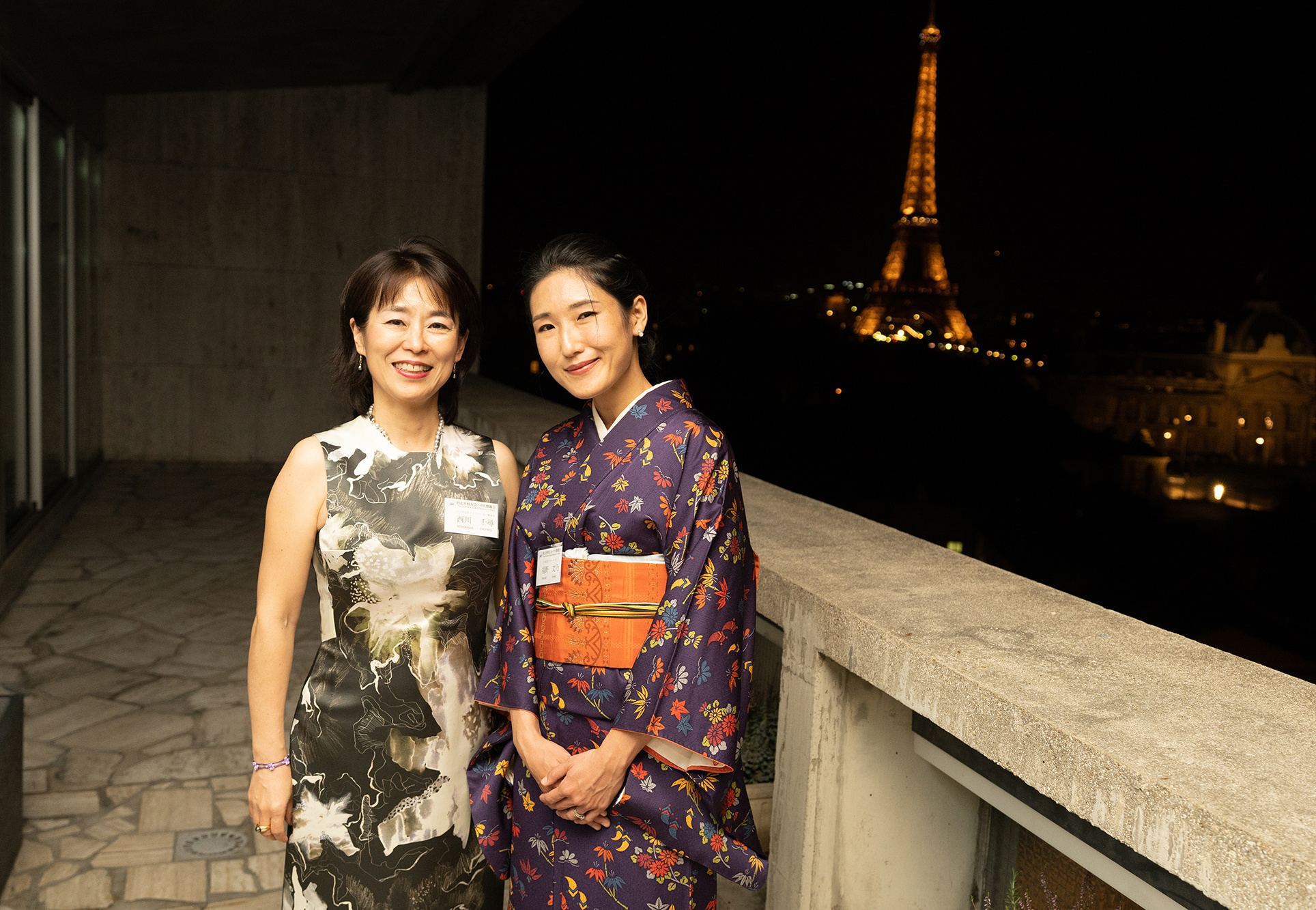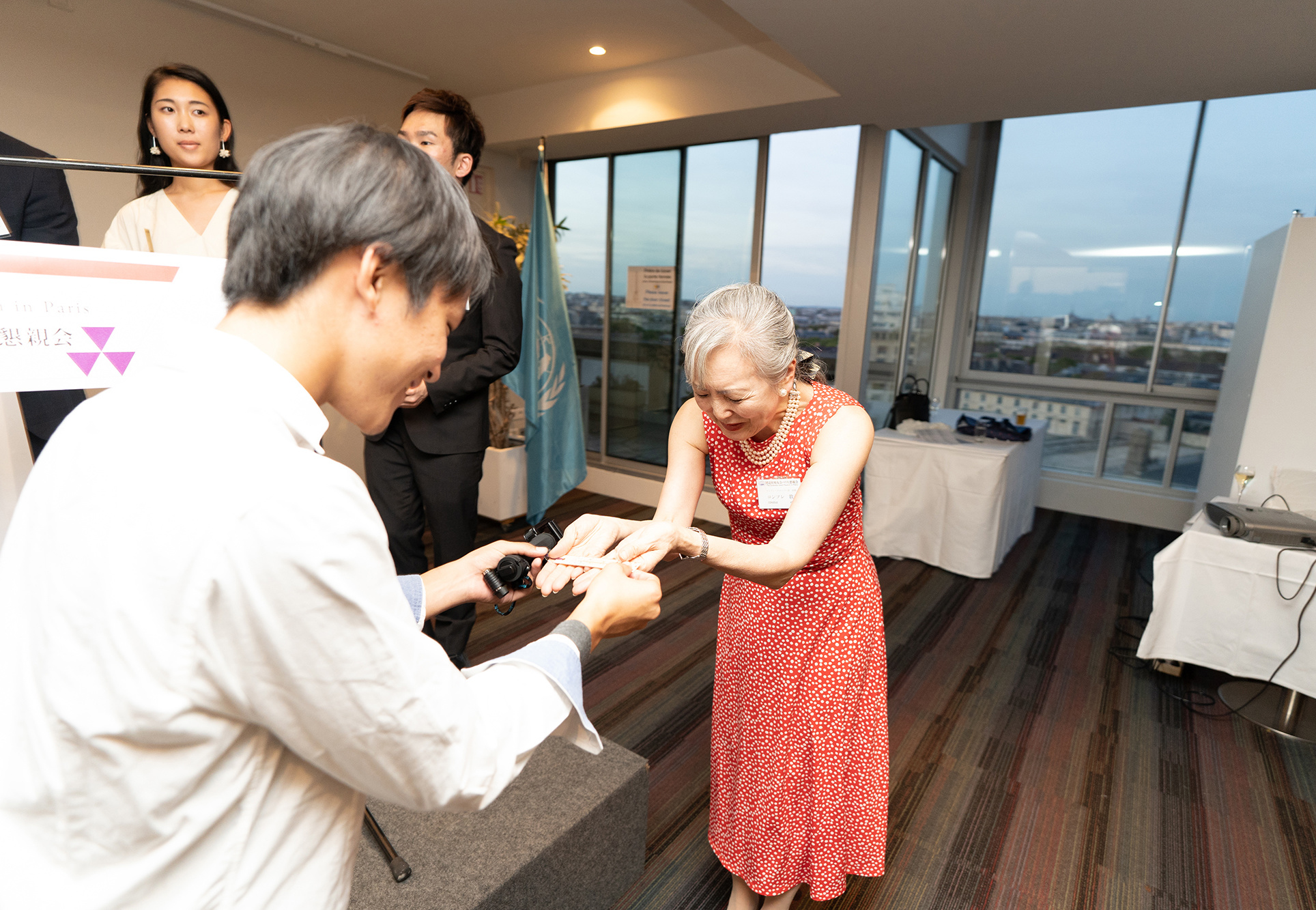 受付を済まされた方は、同志社スペイン会がプロデュースした「ハモン・イベリコ」生ハムにスパークリングワインで、開会までの時間を過ごされました。会場のバルコニーからはエッフェル塔が望める絶好のロケーションで、プロのカメラマンが記念写真の撮影サービス。そしていよいよ開会。