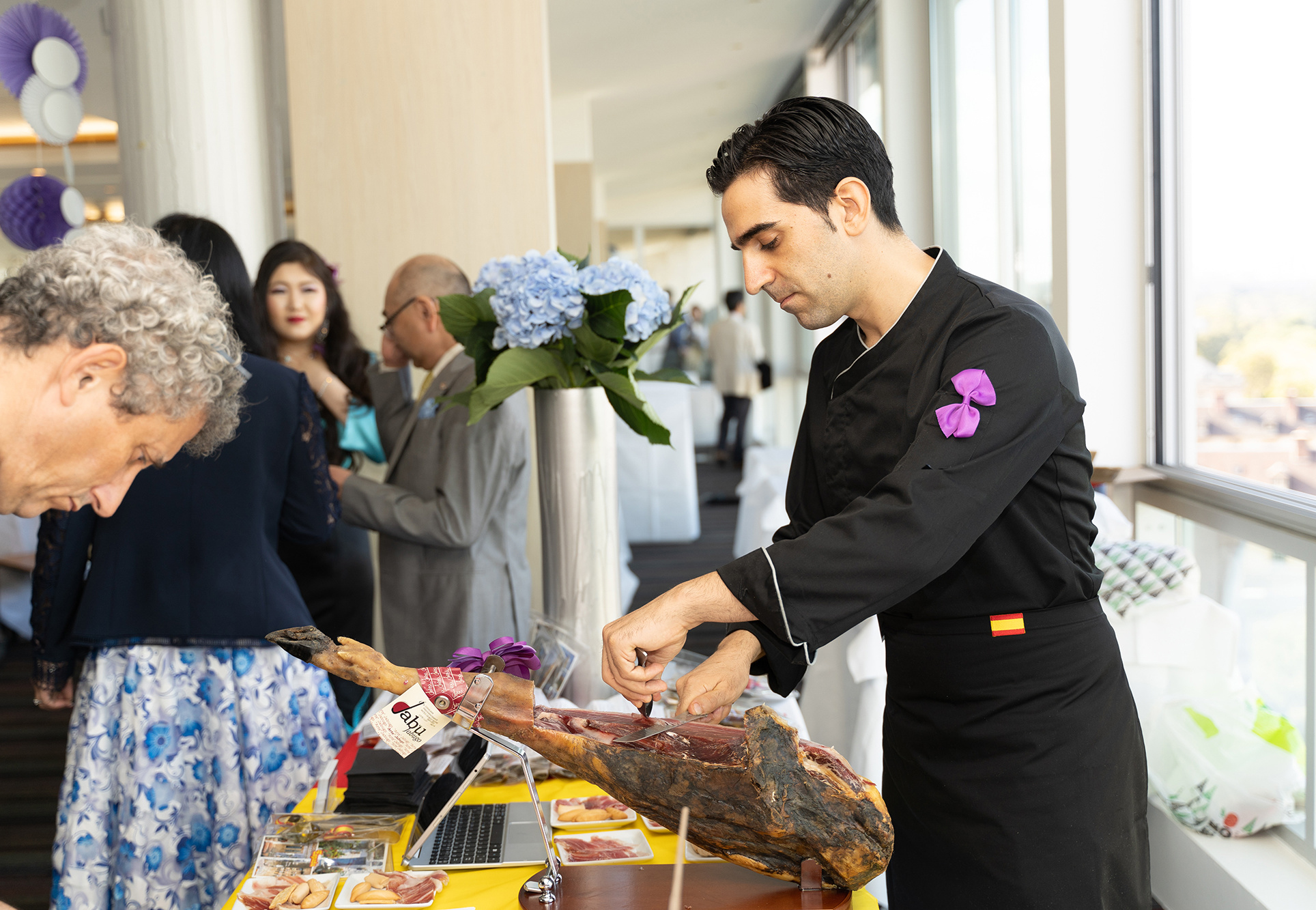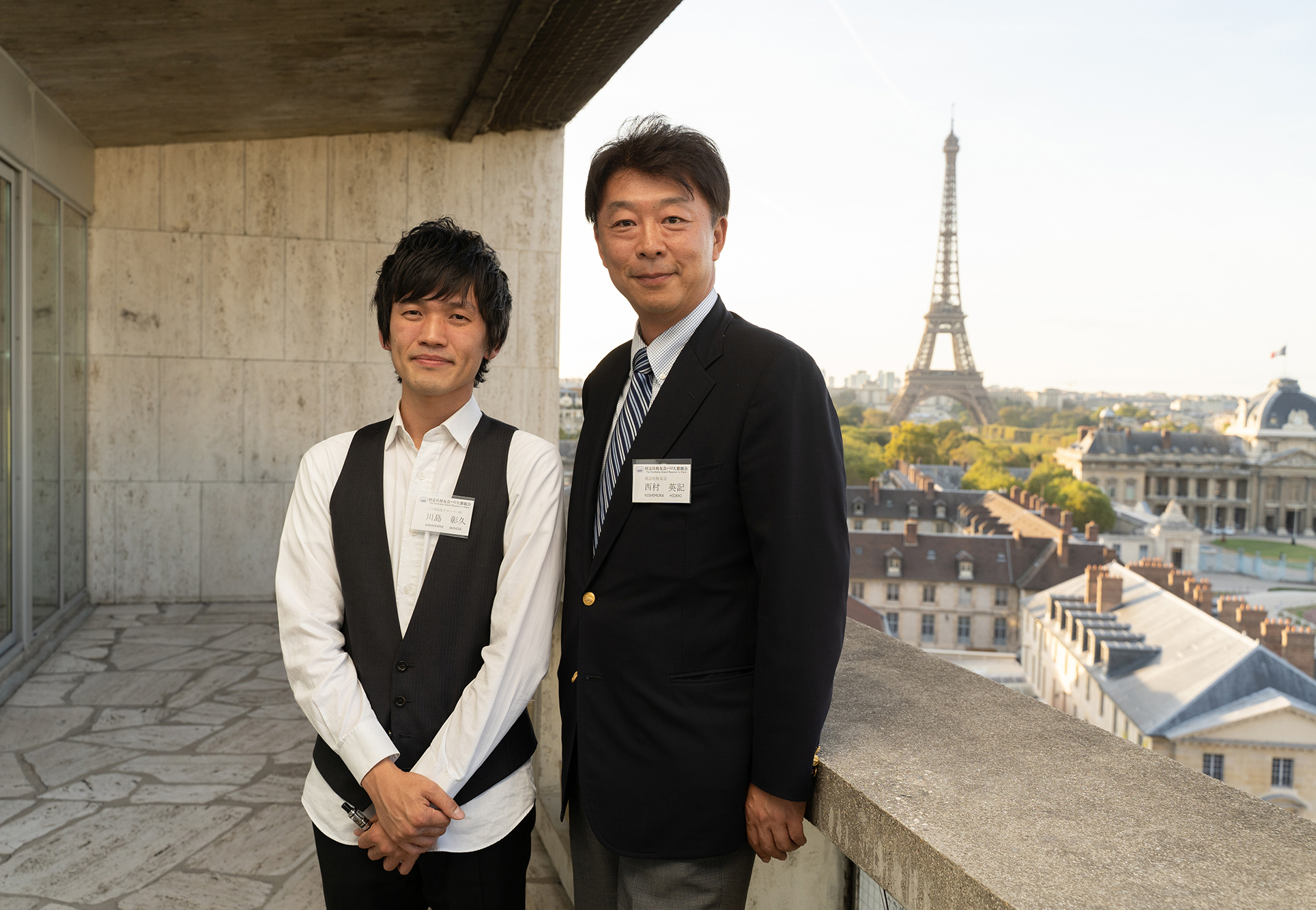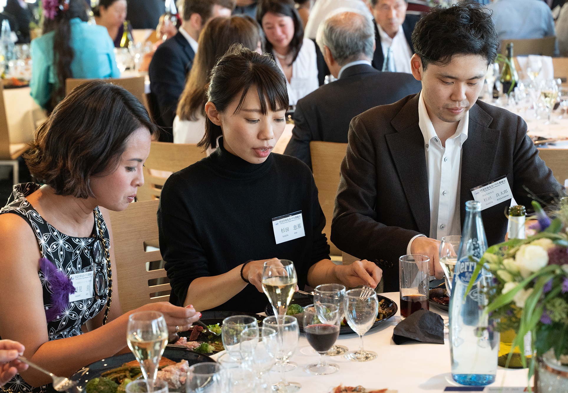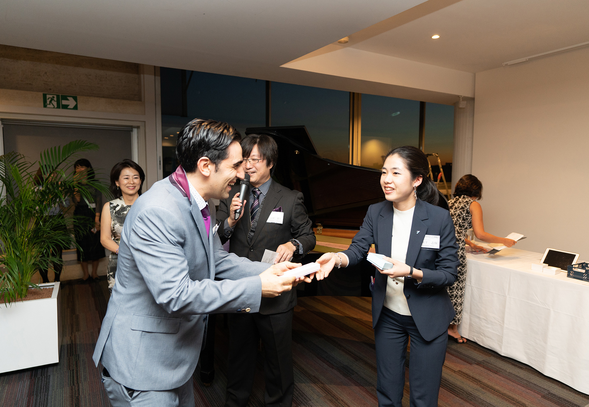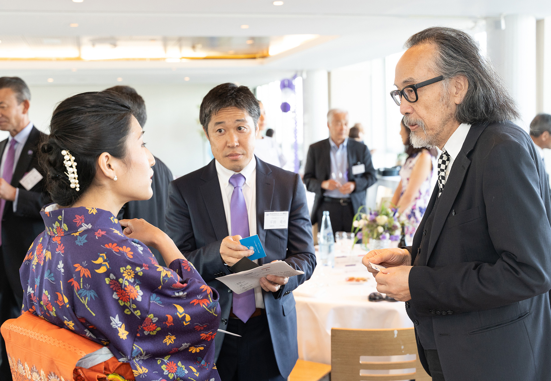受付を済まされた方は、同志社スペイン会がプロデュースした「ハモン・イベリコ」生ハムにスパークリングワインで、開会までの時間を過ごされました。会場のバルコニーからはエッフェル塔が望める絶好のロケーションで、プロのカメラマンが記念写真の撮影サービス。そしていよいよ開会。