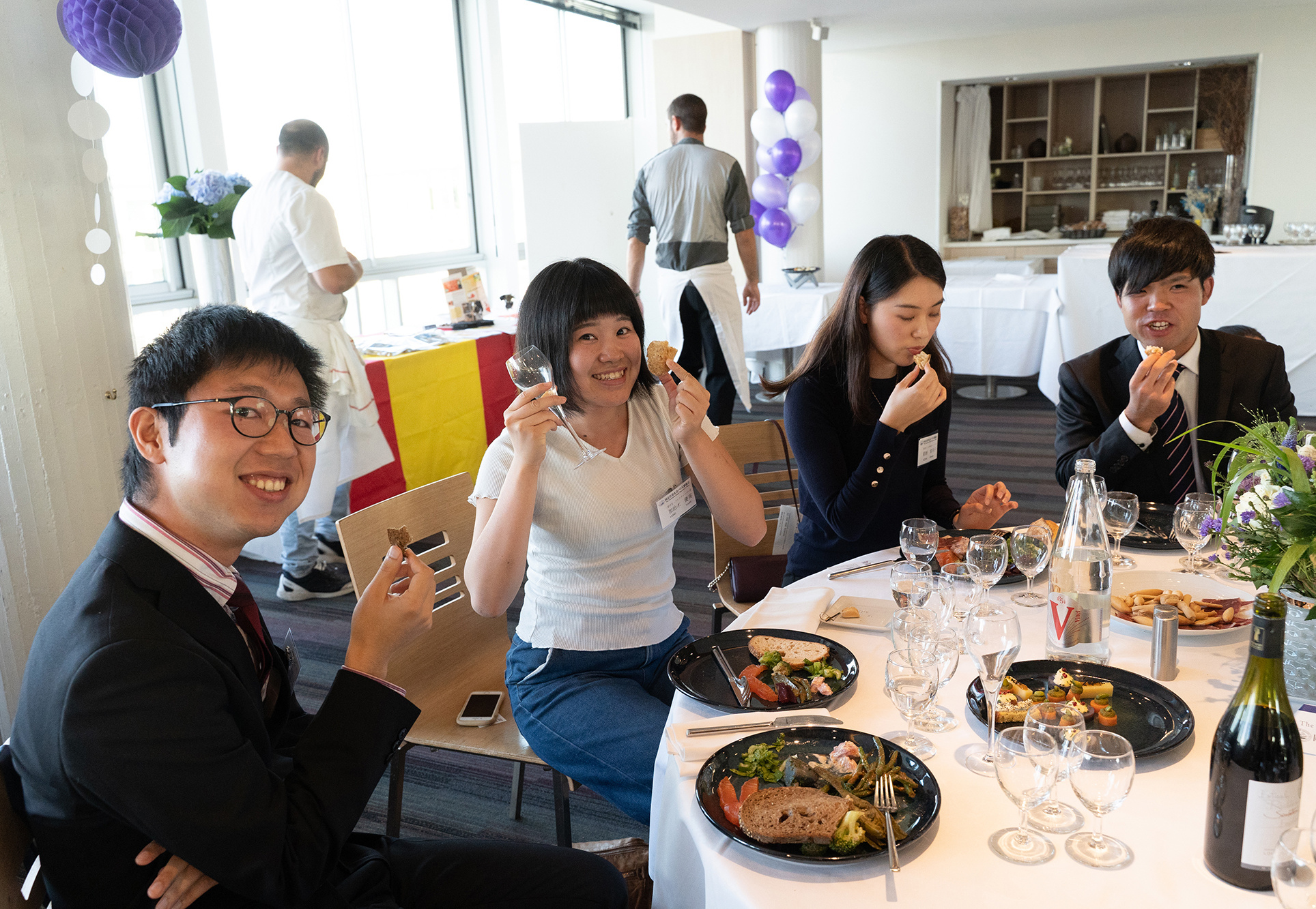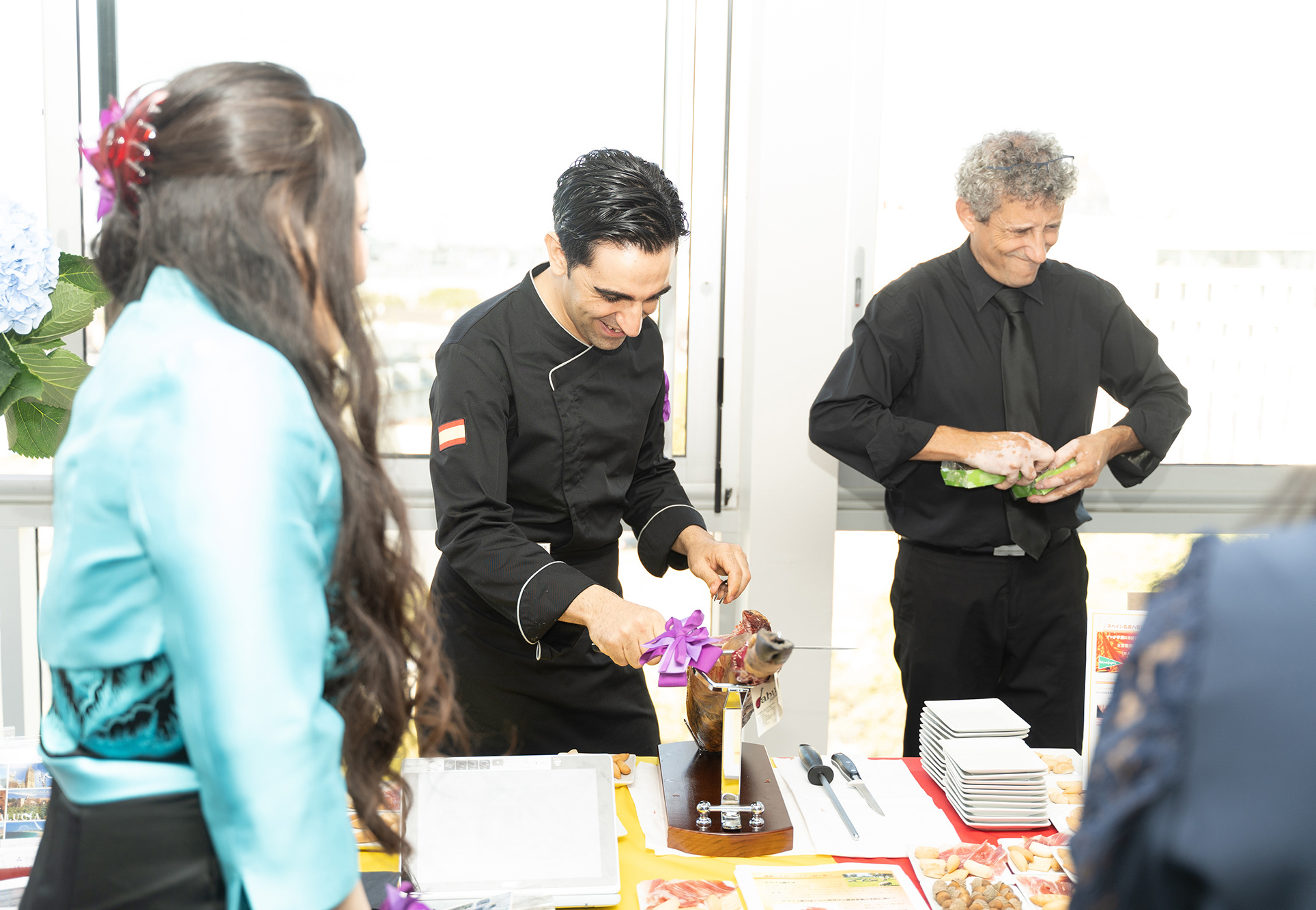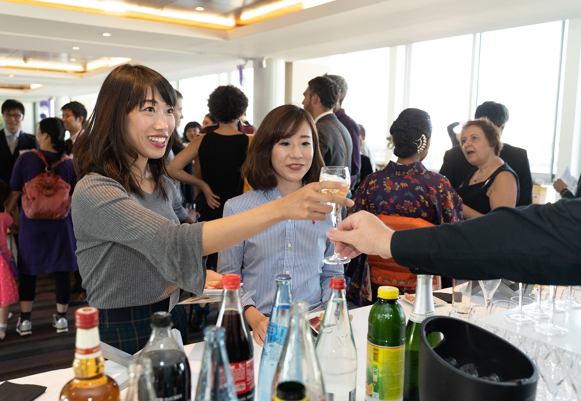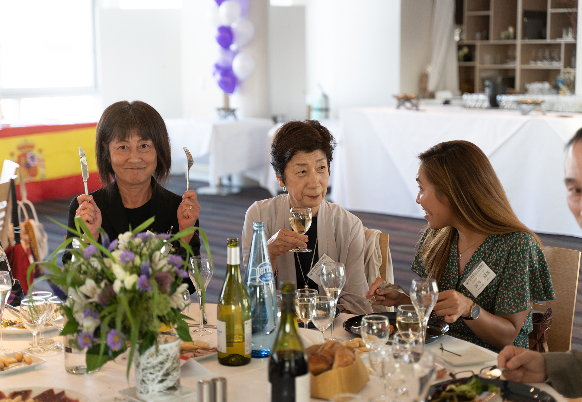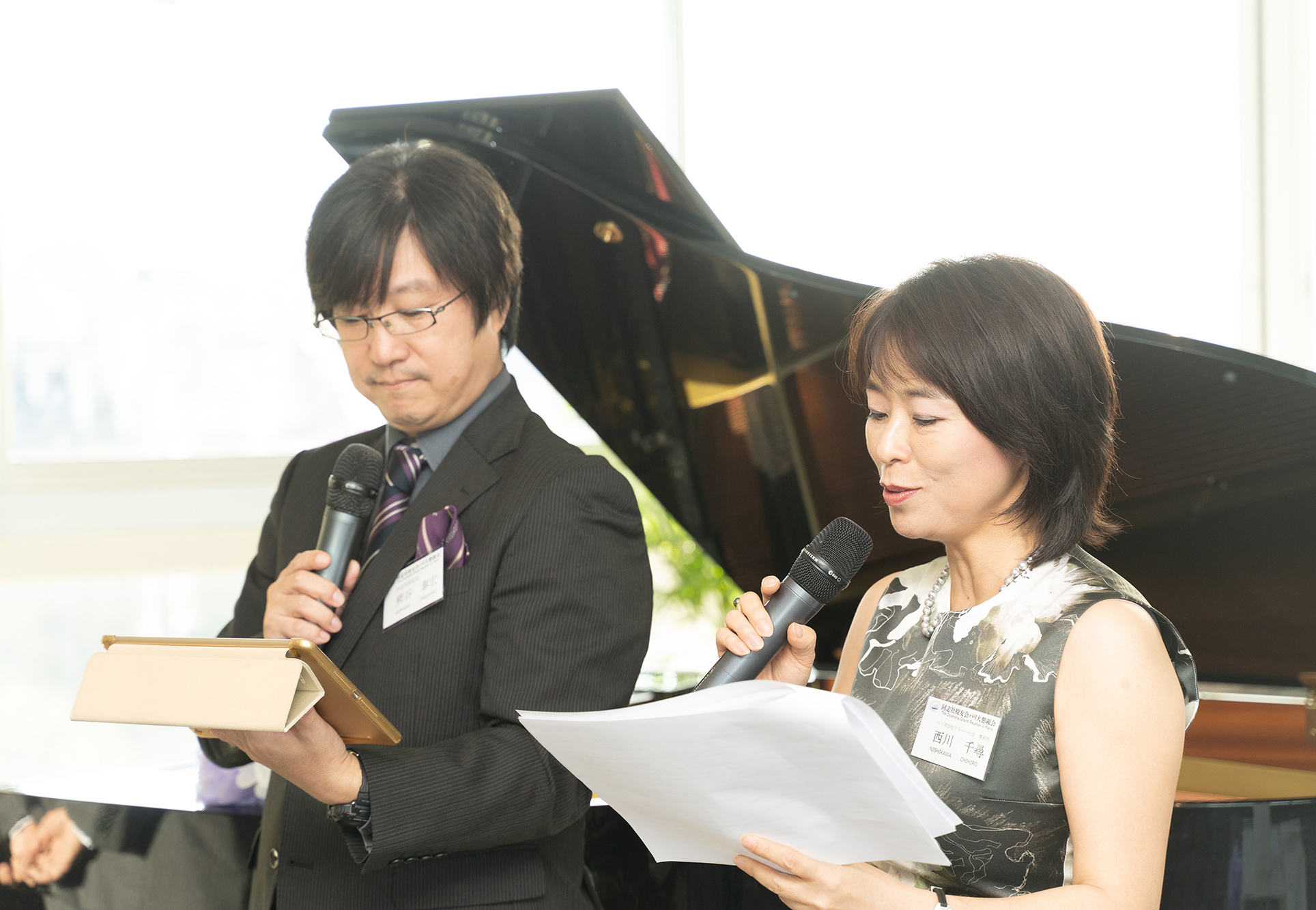 受付を済まされた方は、同志社スペイン会がプロデュースした「ハモン・イベリコ」生ハムにスパークリングワインで、開会までの時間を過ごされました。会場のバルコニーからはエッフェル塔が望める絶好のロケーションで、プロのカメラマンが記念写真の撮影サービス。そしていよいよ開会。