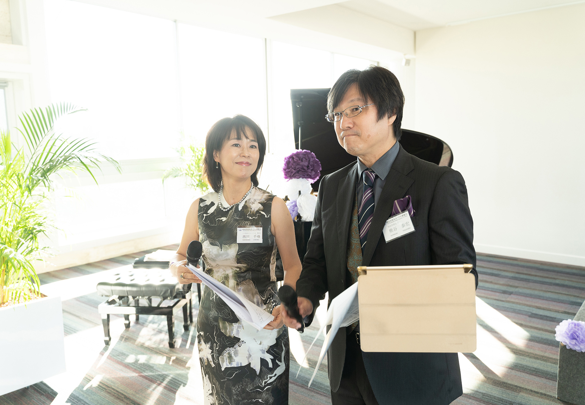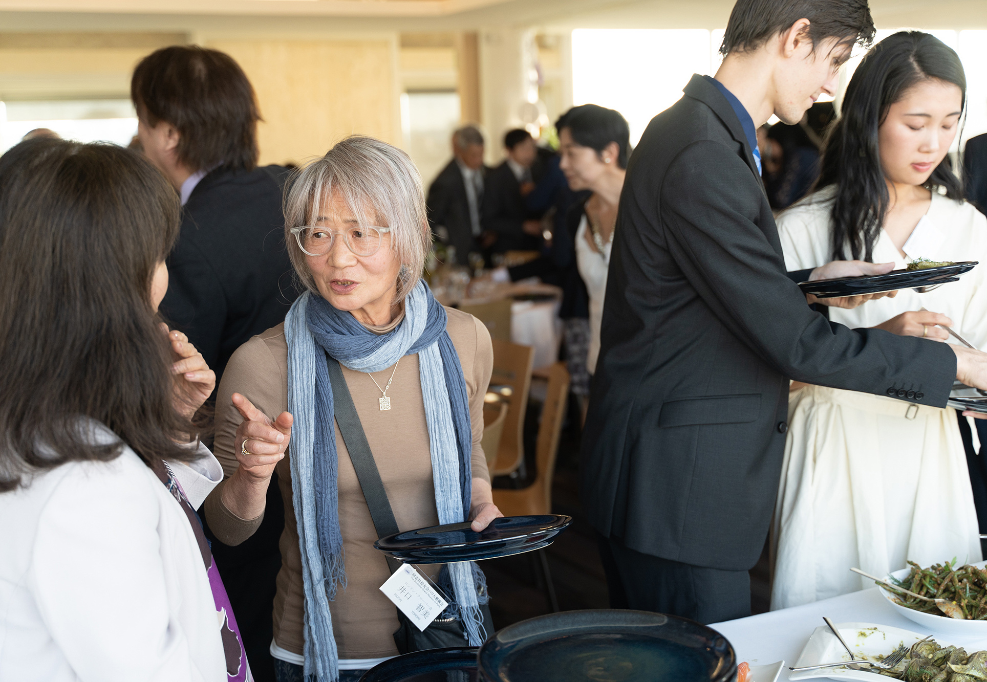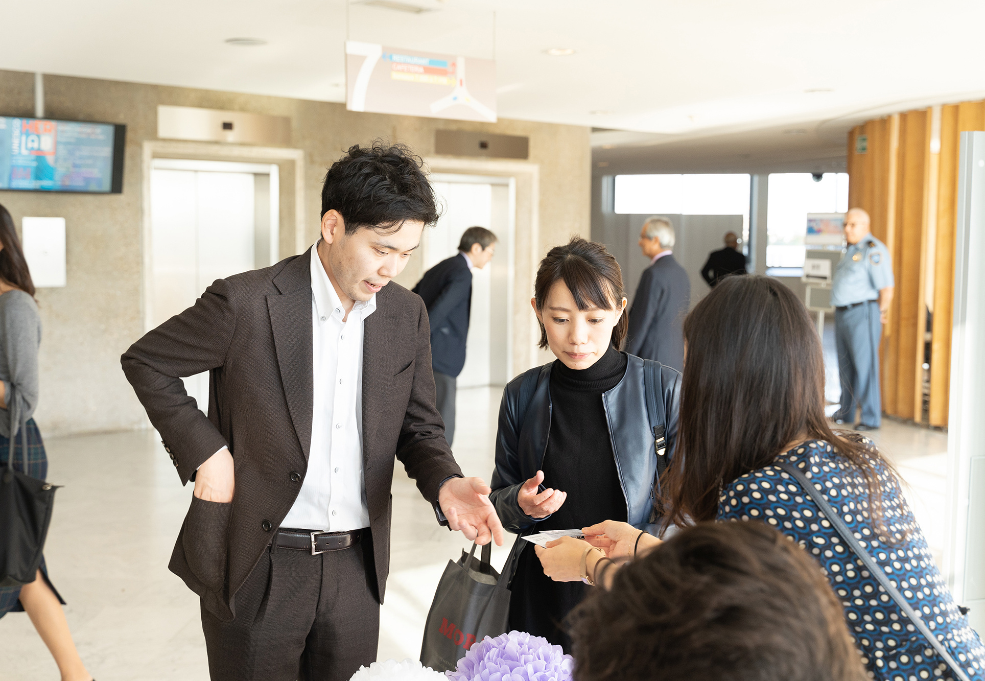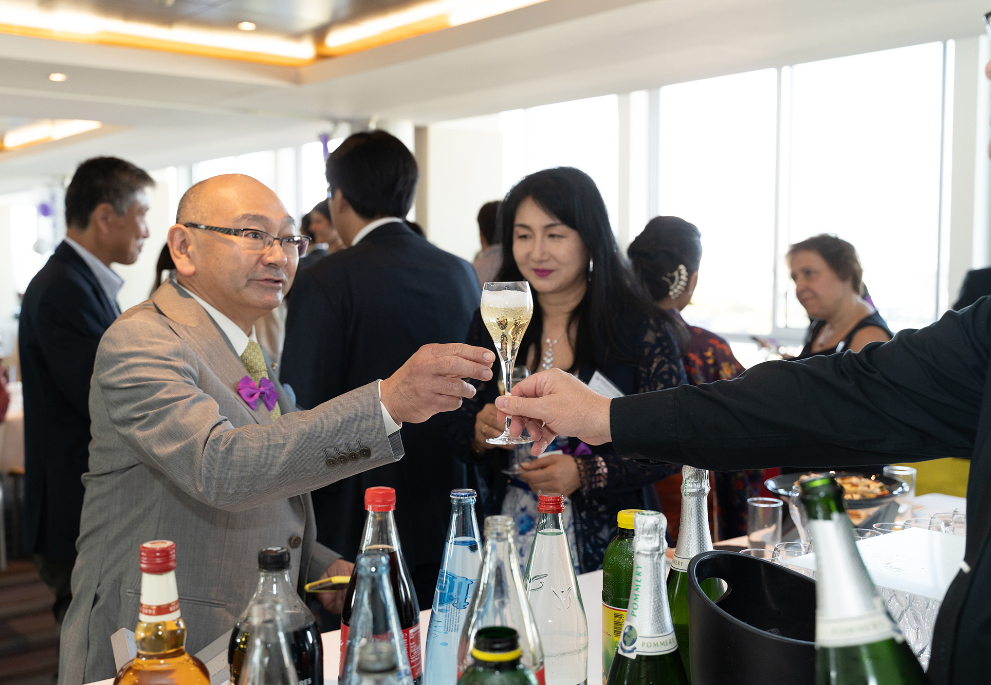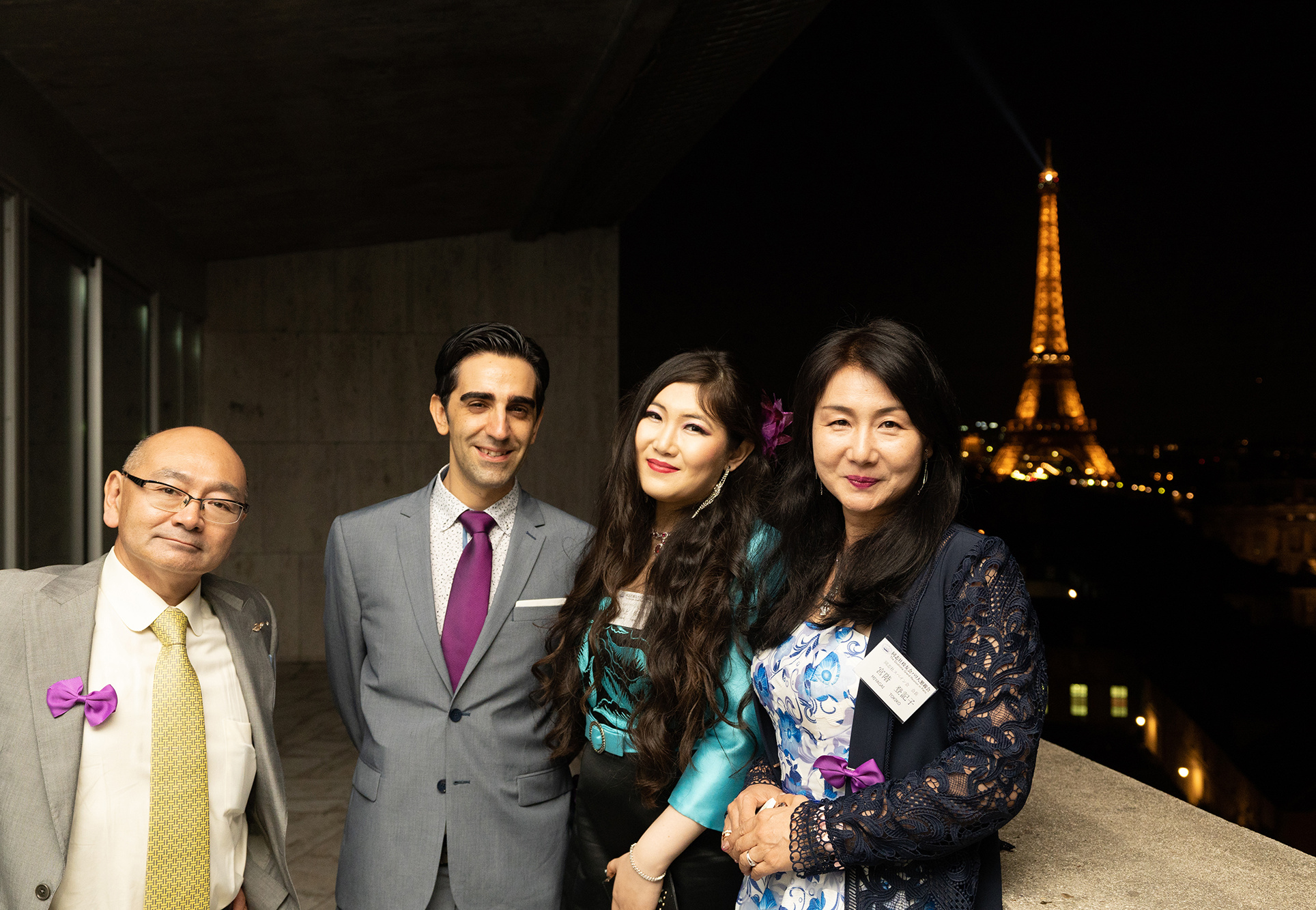 受付を済まされた方は、同志社スペイン会がプロデュースした「ハモン・イベリコ」生ハムにスパークリングワインで、開会までの時間を過ごされました。会場のバルコニーからはエッフェル塔が望める絶好のロケーションで、プロのカメラマンが記念写真の撮影サービス。そしていよいよ開会。