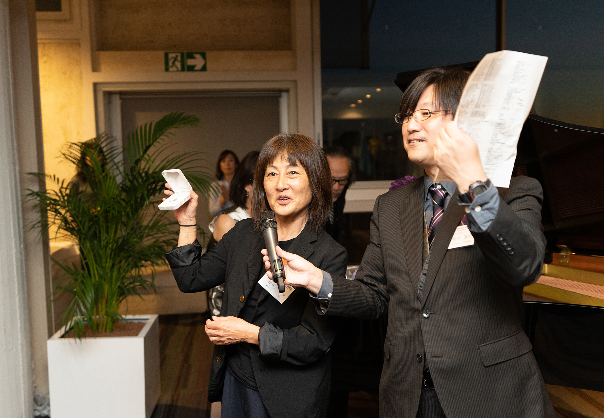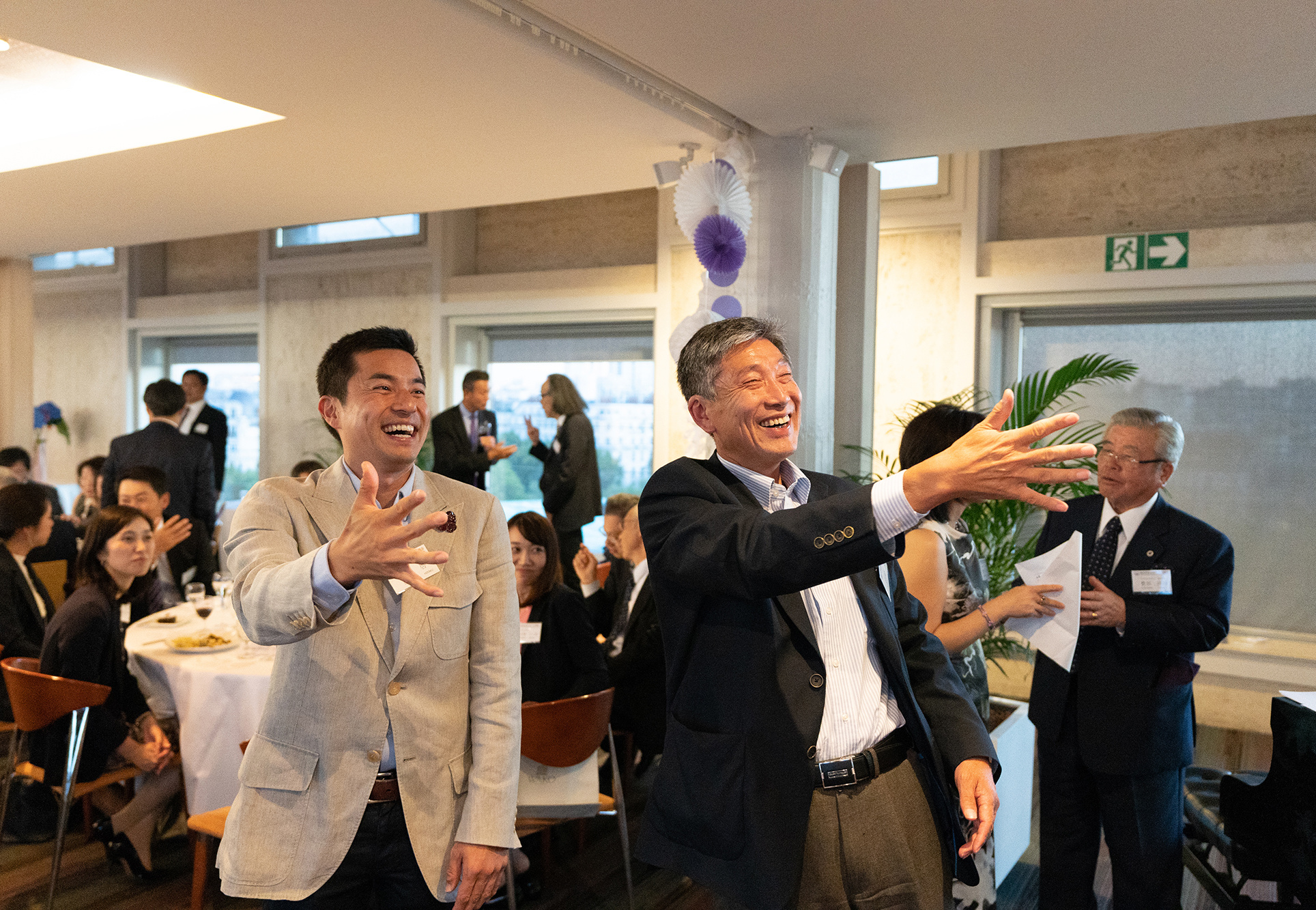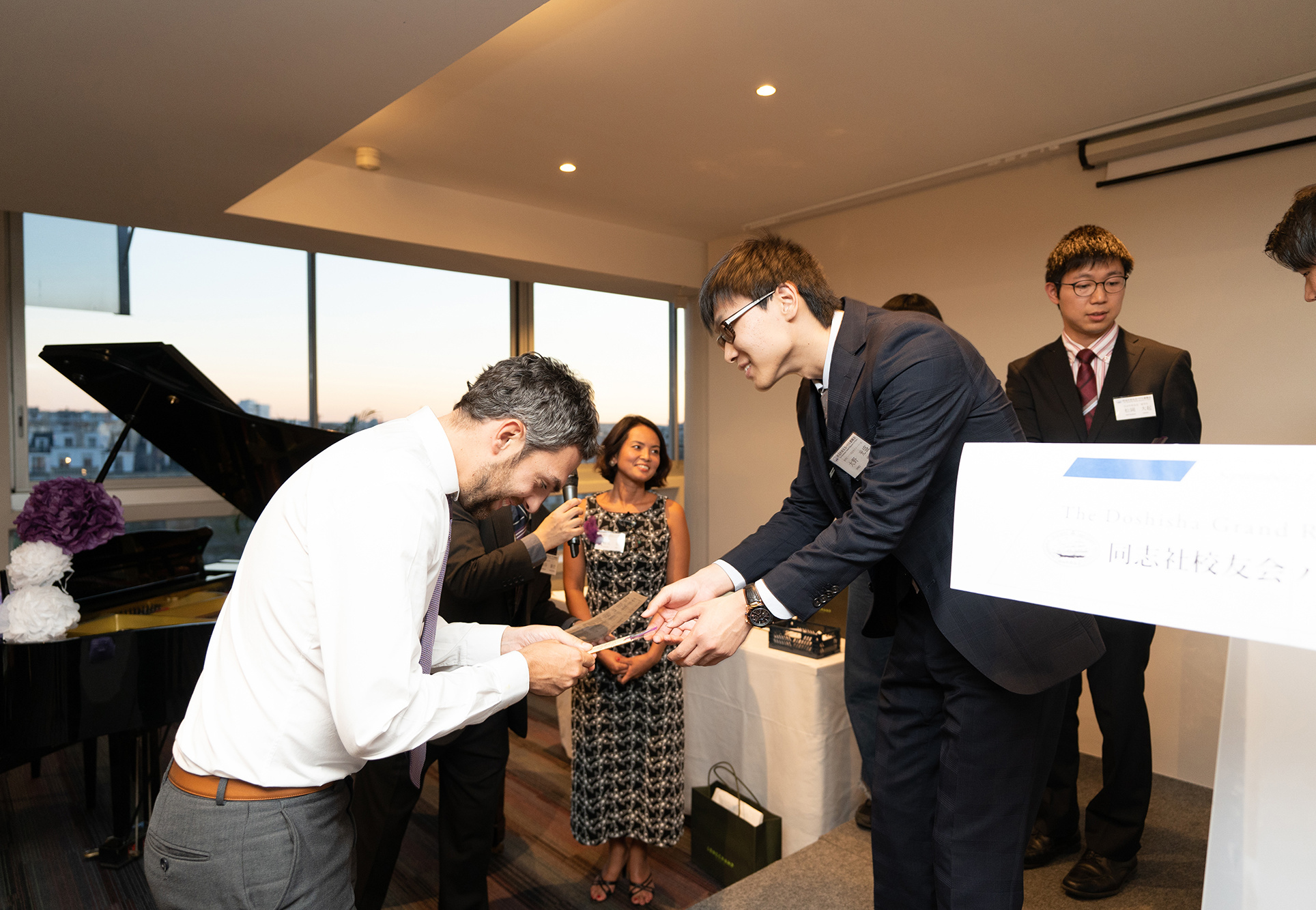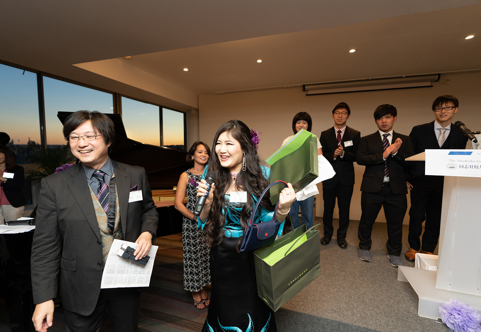 懇親会ではフランス料理に美味しいワインと会話で盛り上がり、会場はさながら同志社の社交場となっていました。各ヨーロッパ支部代表からの近況報告に引き続き、本部の活動報告を同志社校友会長谷川副会長からご報告のあと、いよいよお楽しみの抽選会。今回はヨーロッパ各地で勉学にいそしんでいる留学生の皆さんにお手伝いいただき、福引あり、パリクローバー会黒田会長とのジャンケン大会ありで大いに会場は盛り上がりました。極めつけは今年の葵祭で第63代斎王代を務めた坂下志保さんとのジャンケン大会で、すべての賞品が当選者の皆様にいきわたりました。