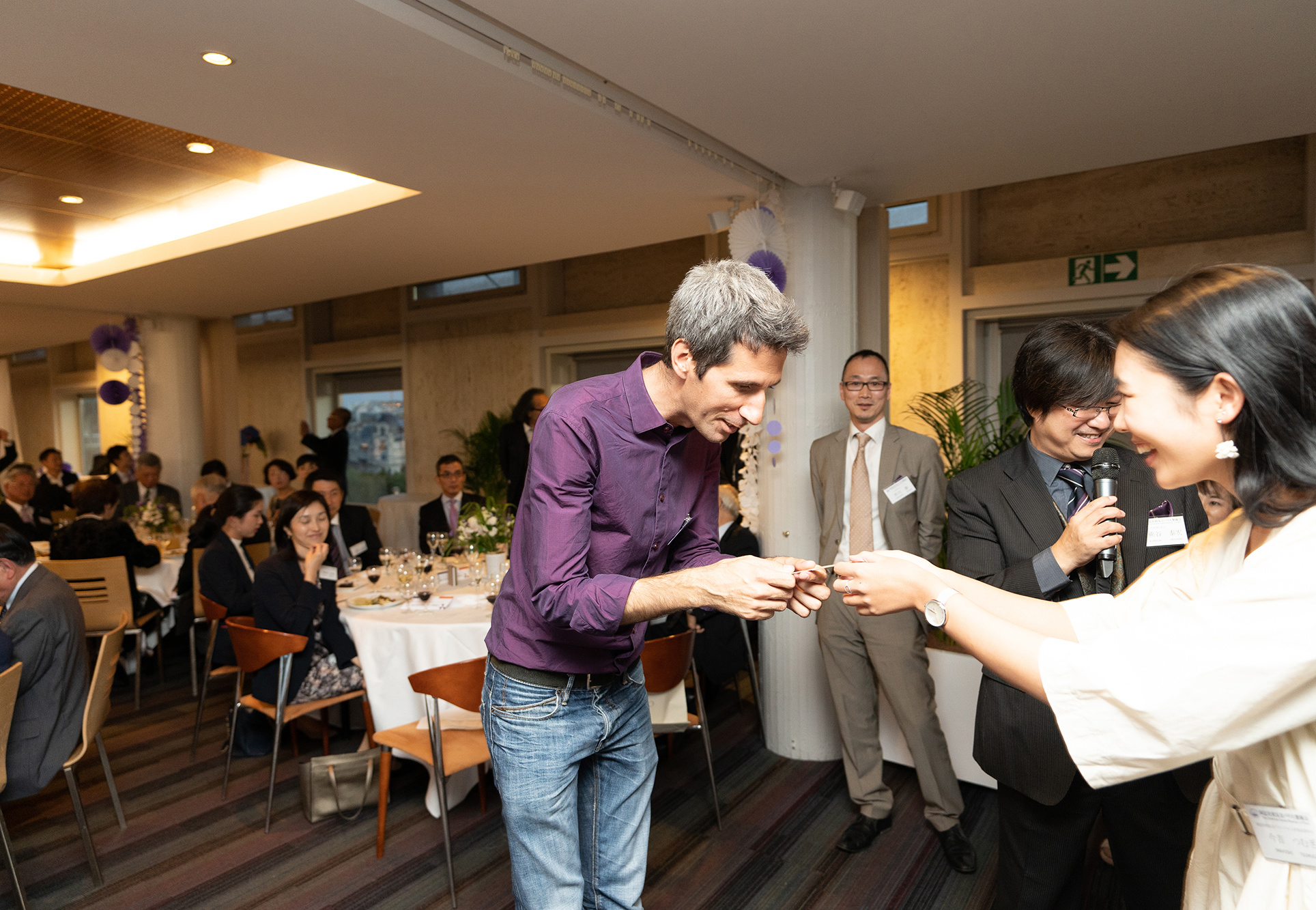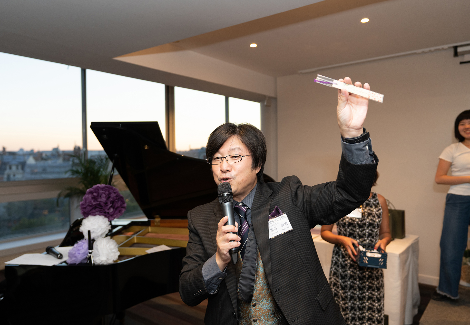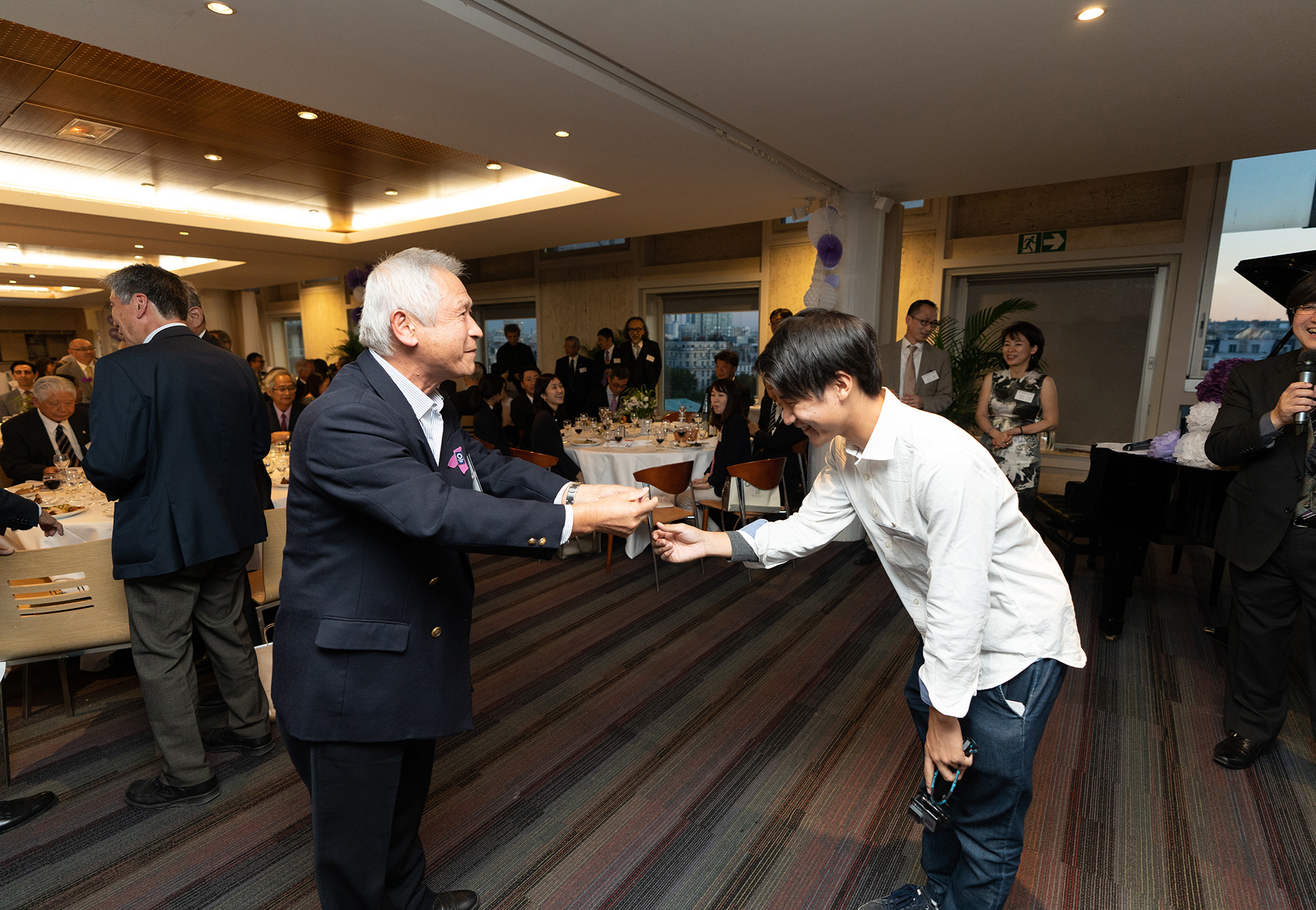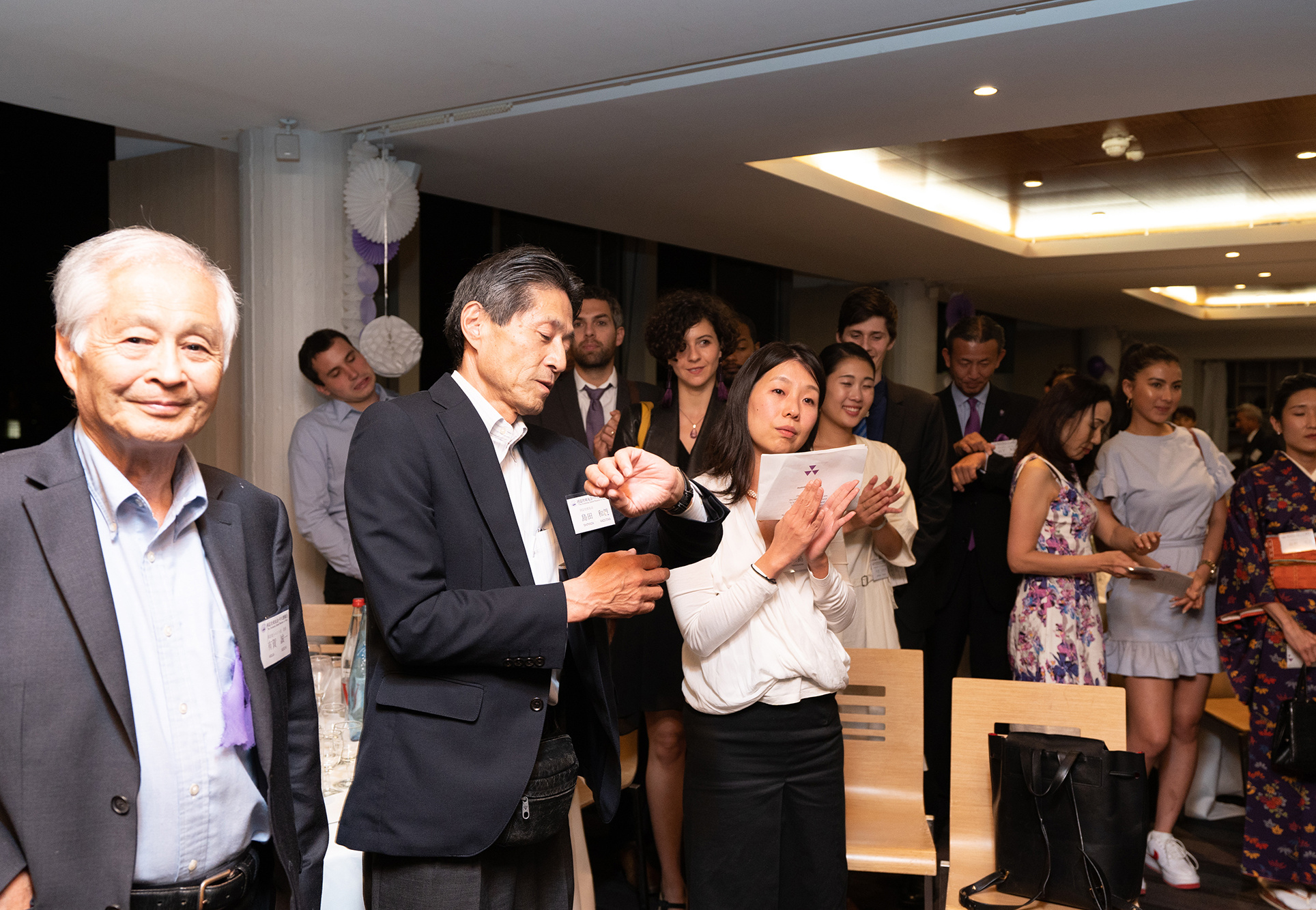 懇親会ではフランス料理に美味しいワインと会話で盛り上がり、会場はさながら同志社の社交場となっていました。各ヨーロッパ支部代表からの近況報告に引き続き、本部の活動報告を同志社校友会長谷川副会長からご報告のあと、いよいよお楽しみの抽選会。今回はヨーロッパ各地で勉学にいそしんでいる留学生の皆さんにお手伝いいただき、福引あり、パリクローバー会黒田会長とのジャンケン大会ありで大いに会場は盛り上がりました。極めつけは今年の葵祭で第63代斎王代を務めた坂下志保さんとのジャンケン大会で、すべての賞品が当選者の皆様にいきわたりました。