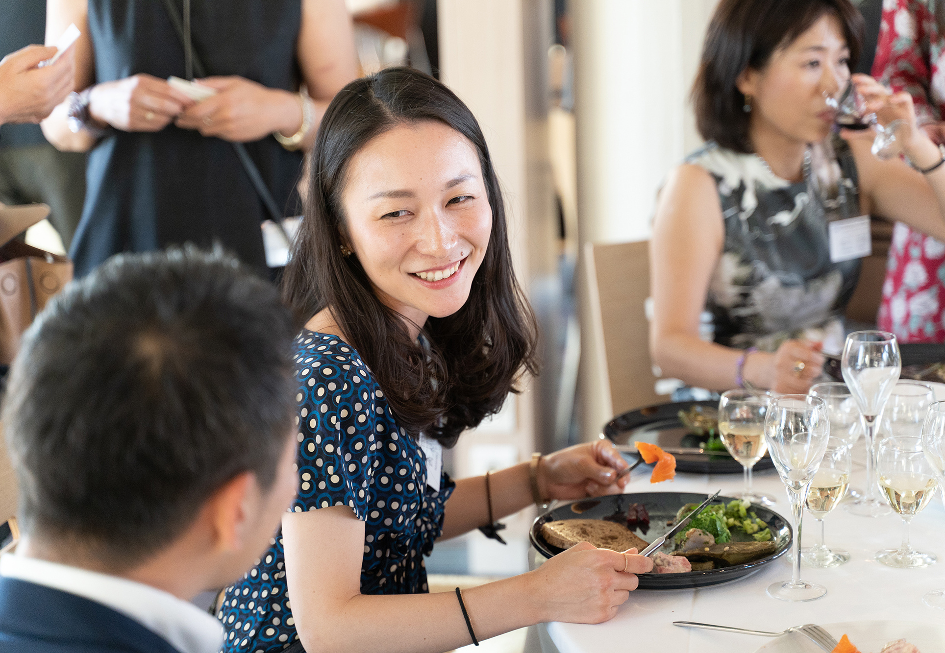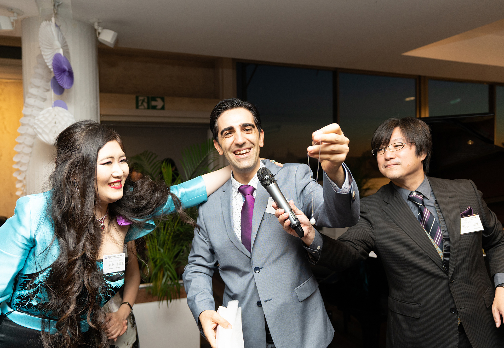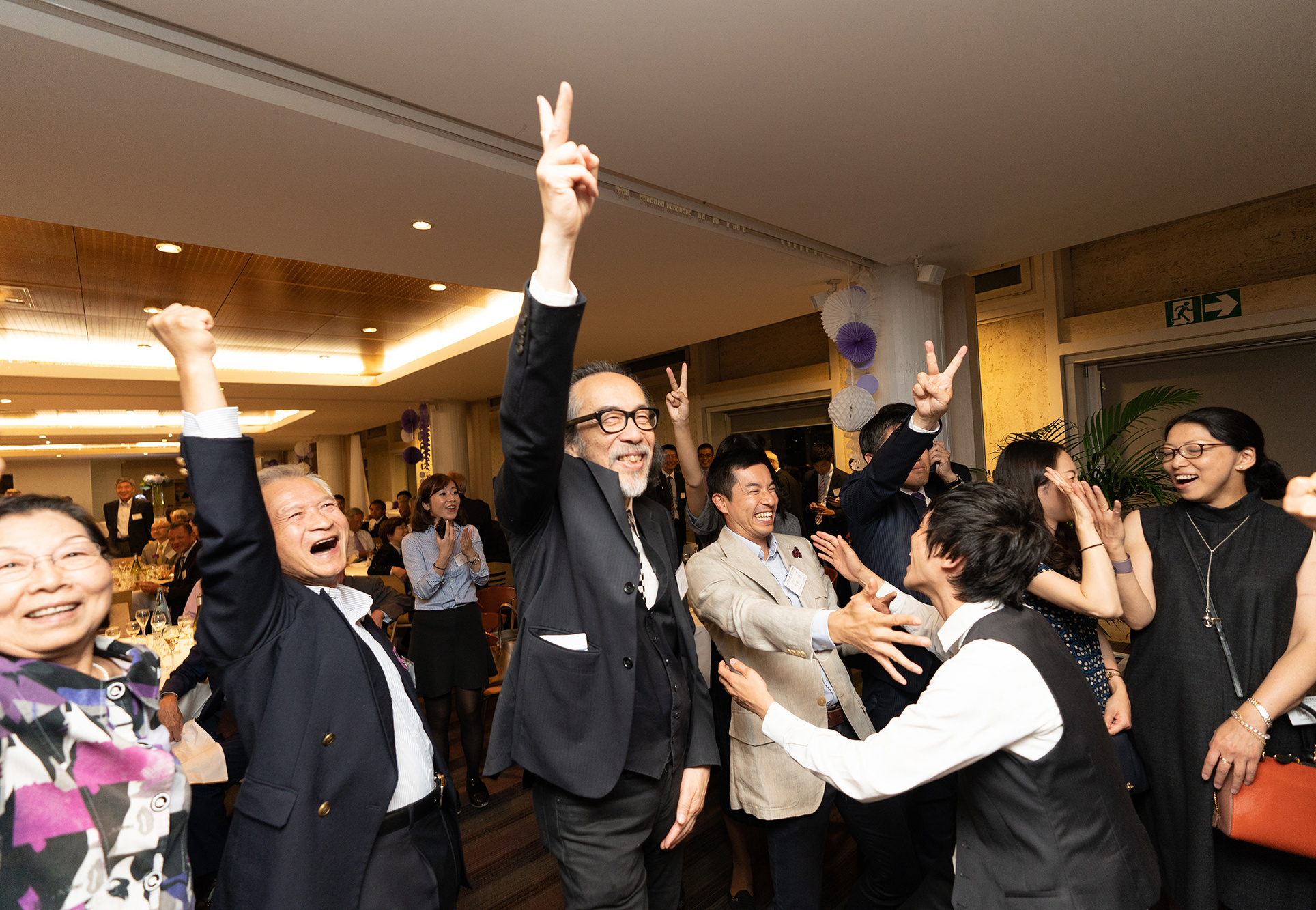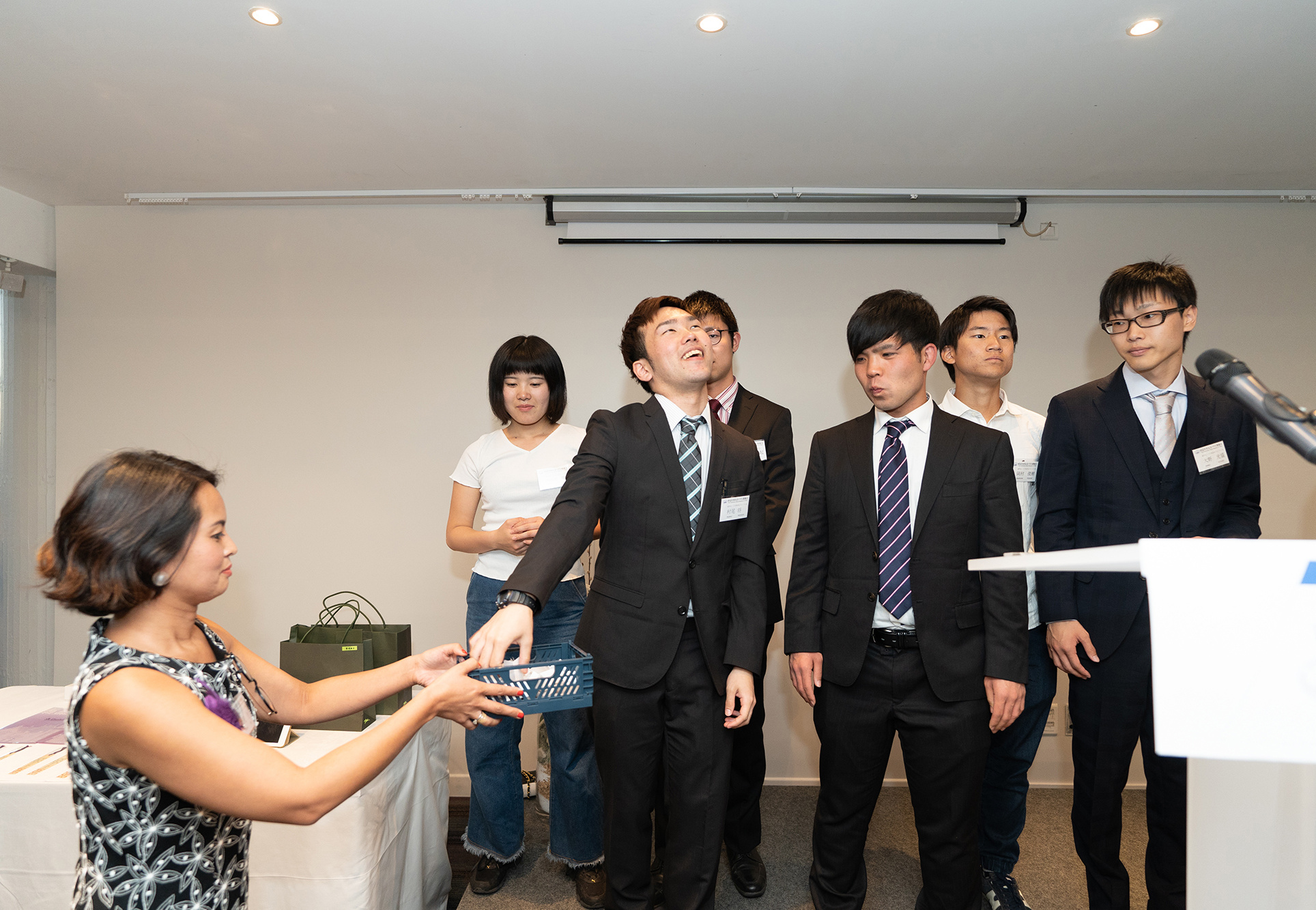 懇親会ではフランス料理に美味しいワインと会話で盛り上がり、会場はさながら同志社の社交場となっていました。各ヨーロッパ支部代表からの近況報告に引き続き、本部の活動報告を同志社校友会長谷川副会長からご報告のあと、いよいよお楽しみの抽選会。今回はヨーロッパ各地で勉学にいそしんでいる留学生の皆さんにお手伝いいただき、福引あり、パリクローバー会黒田会長とのジャンケン大会ありで大いに会場は盛り上がりました。極めつけは今年の葵祭で第63代斎王代を務めた坂下志保さんとのジャンケン大会で、すべての賞品が当選者の皆様にいきわたりました。