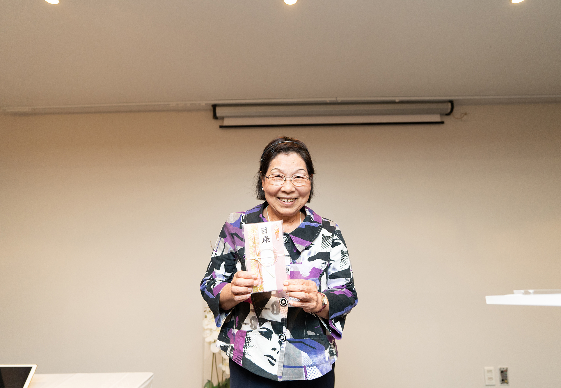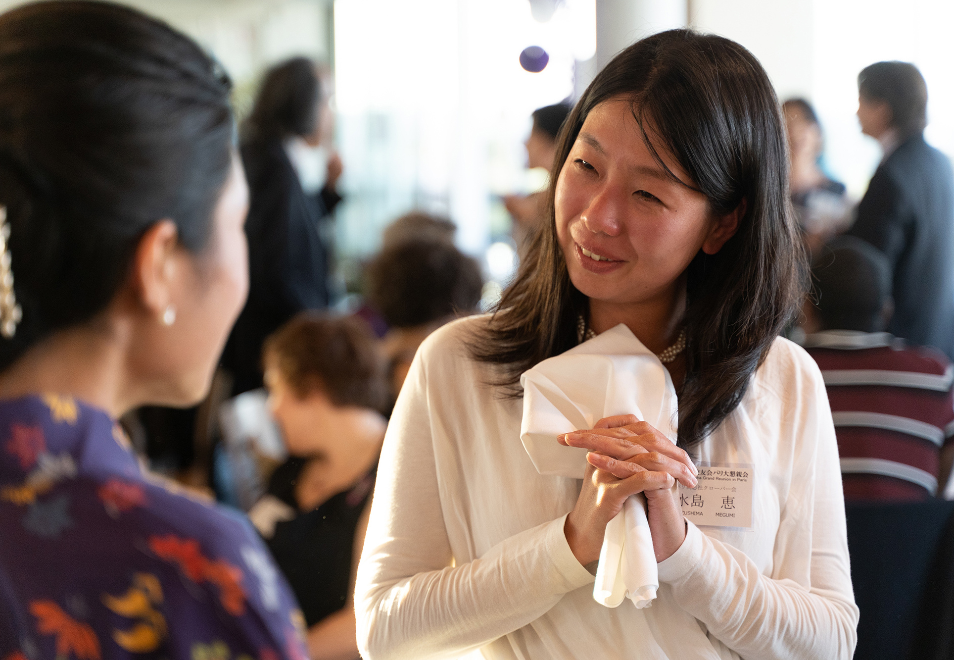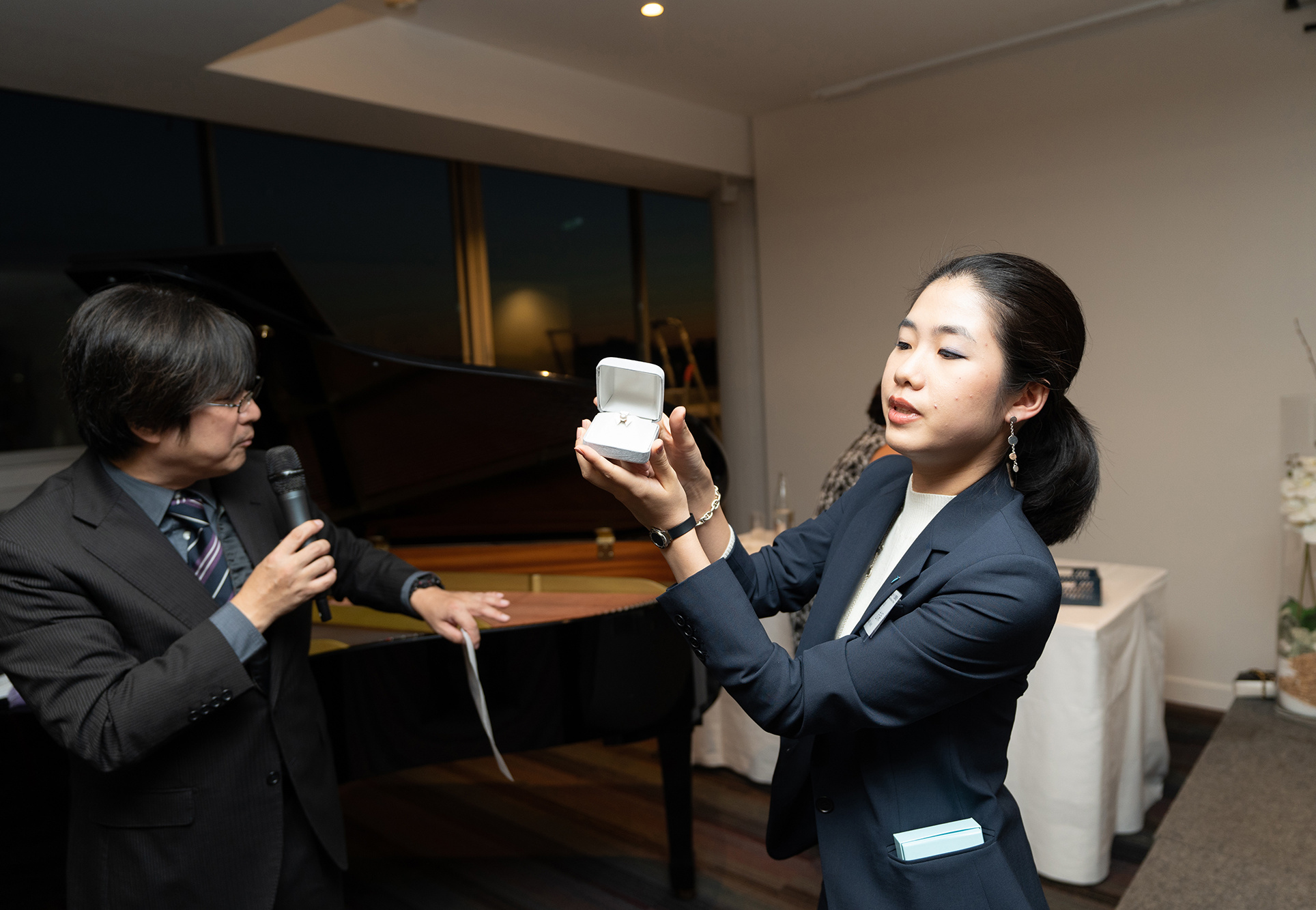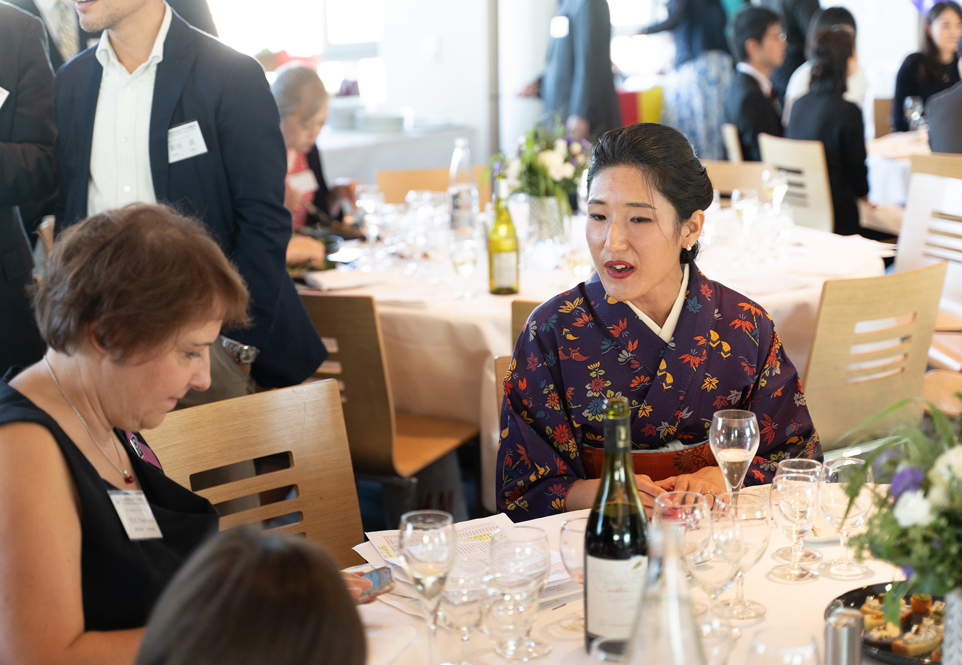 懇親会ではフランス料理に美味しいワインと会話で盛り上がり、会場はさながら同志社の社交場となっていました。各ヨーロッパ支部代表からの近況報告に引き続き、本部の活動報告を同志社校友会長谷川副会長からご報告のあと、いよいよお楽しみの抽選会。今回はヨーロッパ各地で勉学にいそしんでいる留学生の皆さんにお手伝いいただき、福引あり、パリクローバー会黒田会長とのジャンケン大会ありで大いに会場は盛り上がりました。極めつけは今年の葵祭で第63代斎王代を務めた坂下志保さんとのジャンケン大会で、すべての賞品が当選者の皆様にいきわたりました。