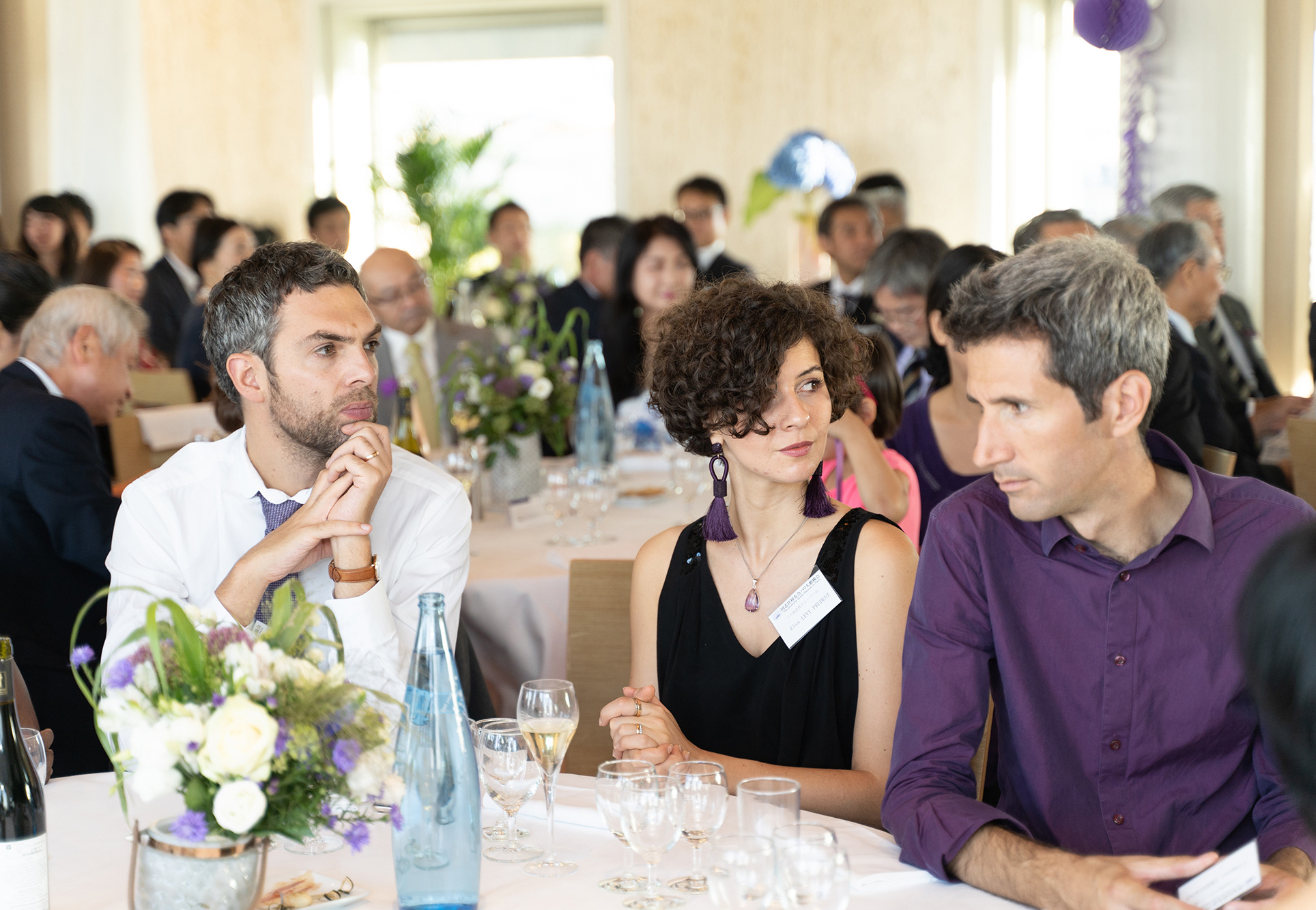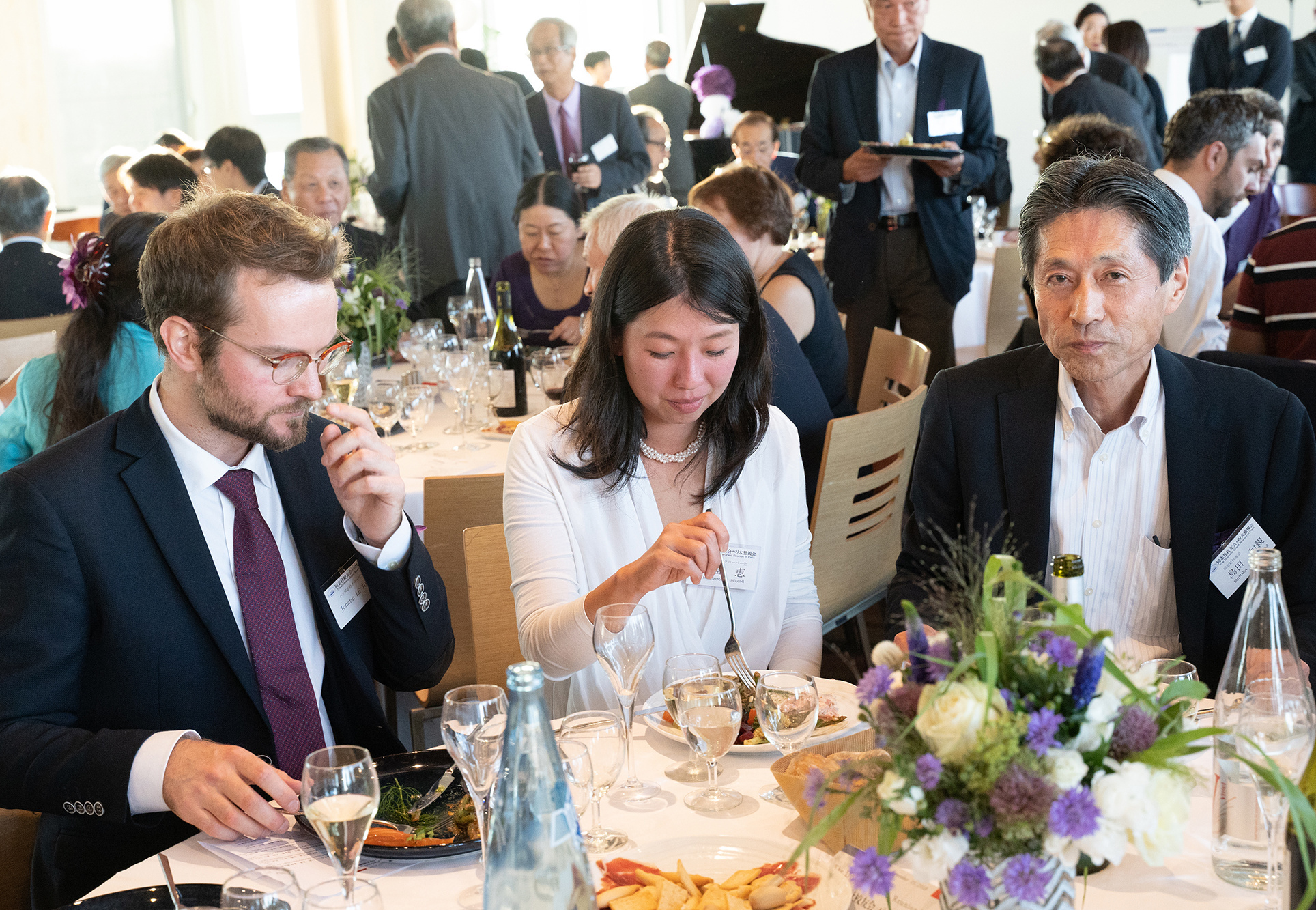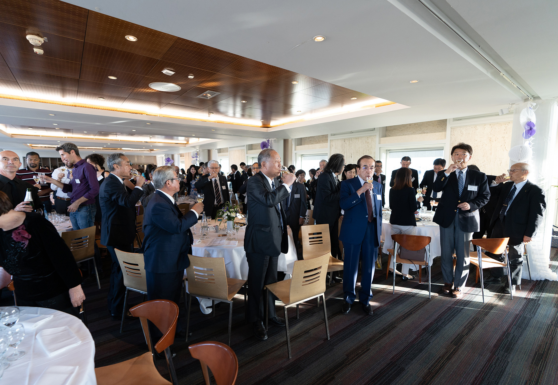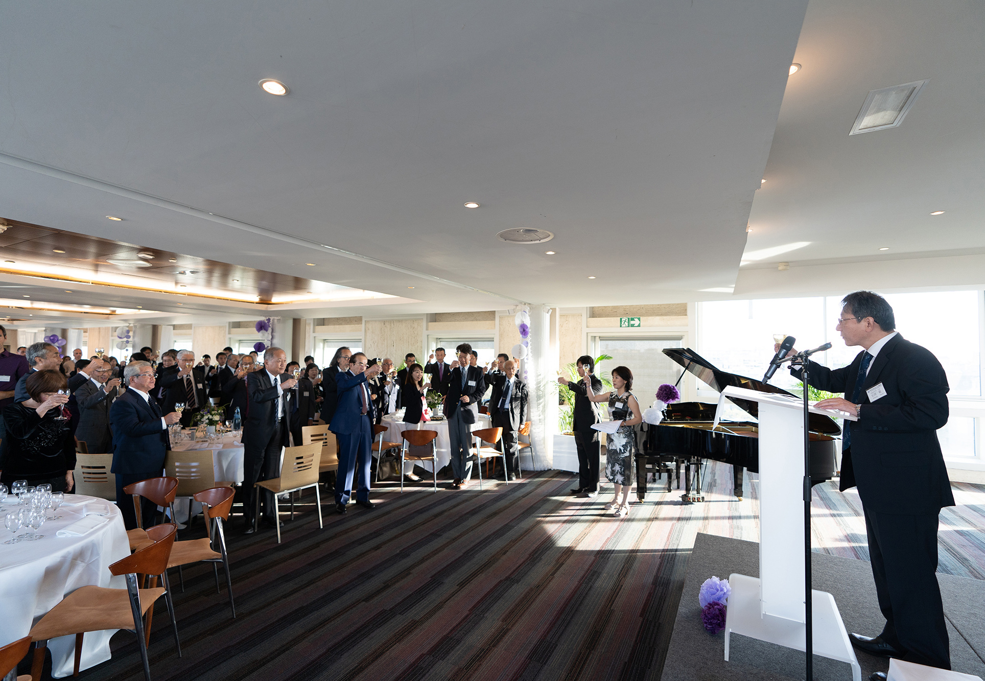 同志社大学松岡学長からは、ヨーロッパ、特にフランスとは非常に連携が深く、大学のグローバル化を進めるうえで重要な拠点のひとつとなっている。また2017年度からドイツの名門大学であるテュービンゲン大学内に「同志社大学テュービンゲンEUキャンパス」を設置し、はじめて海外にキャンパスと名の付く事業を展開する。事務所では学生リクルーティングなどをメインに実施してきたが、このEUキャンパスでは、留学プログラムや、交換客員研究員の活動拠点になるなど、教育・研究面で密接なつながりを有したいと考えているとご挨拶のあと、乾杯の発声をいただきました。