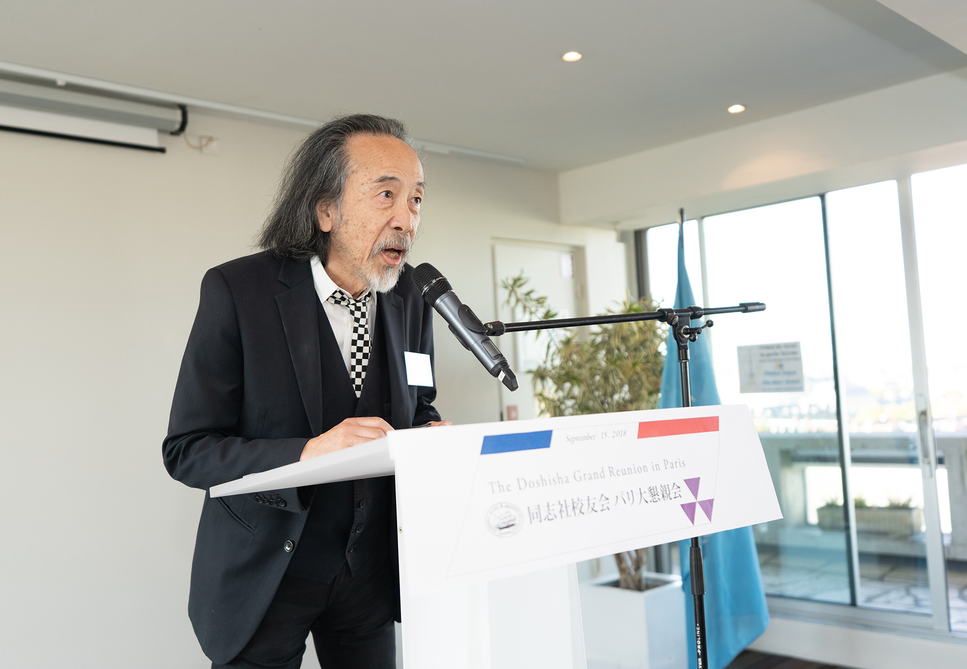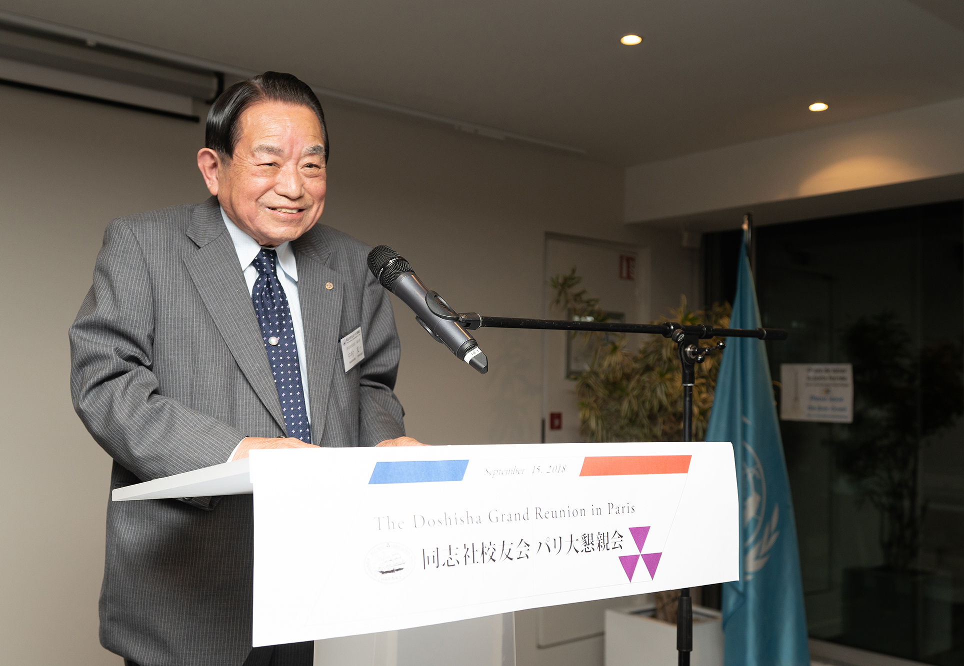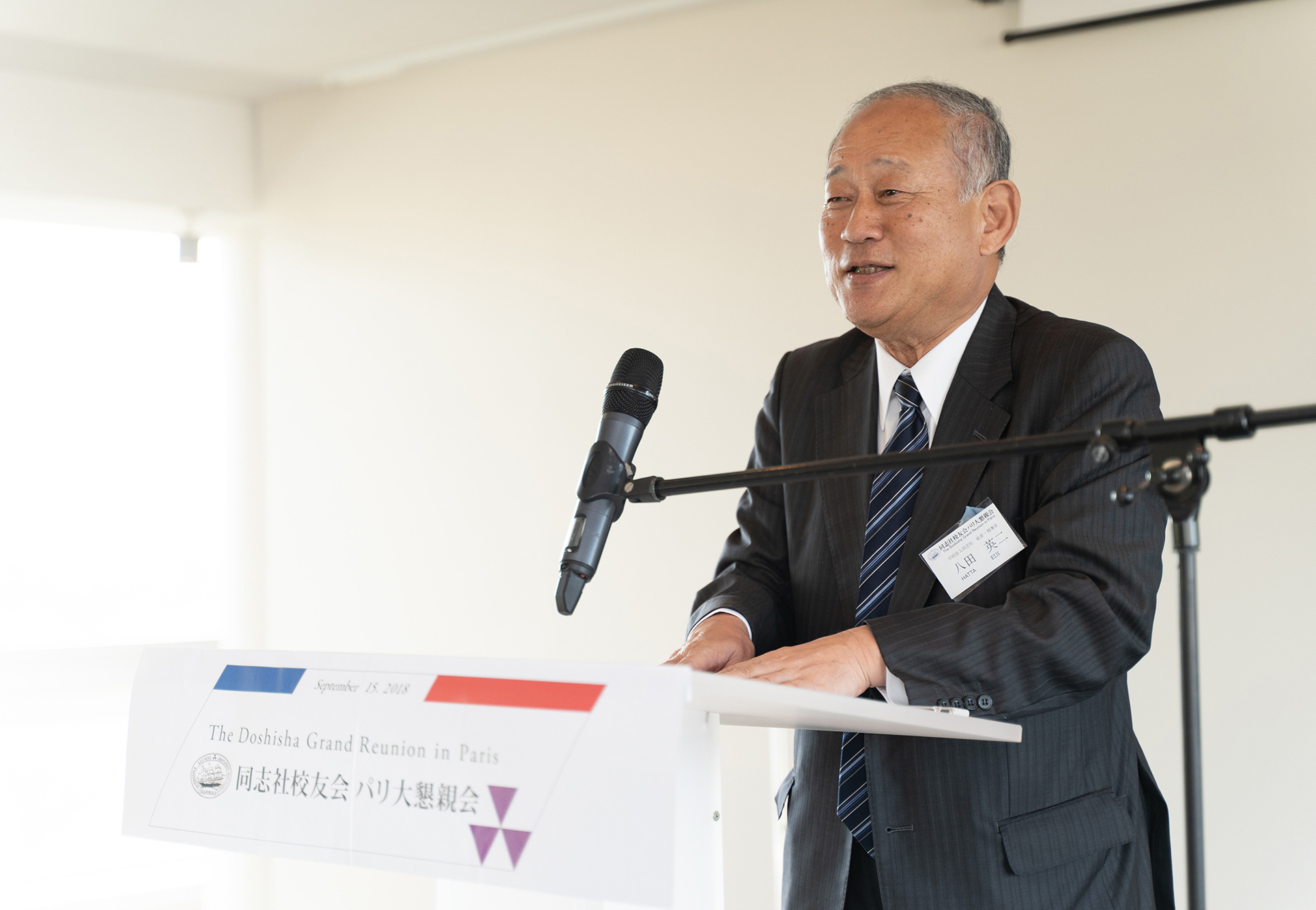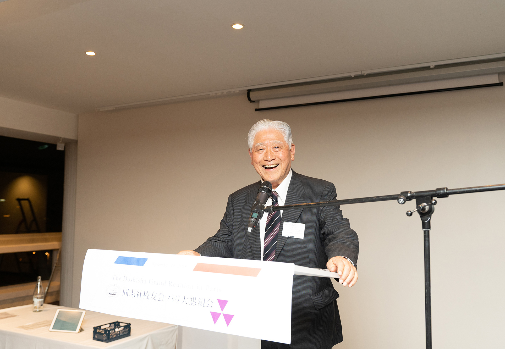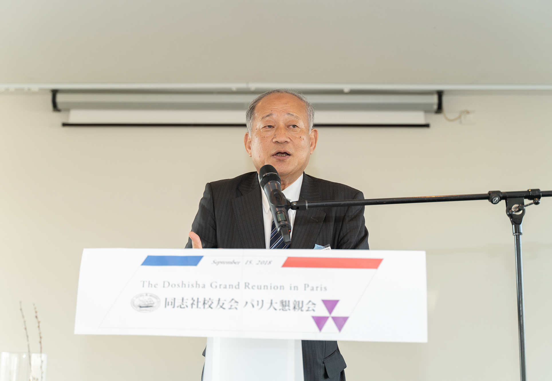 同志社校友会井上会長から、ここ数年の同志社校友会のグローバル化のスピードには目を見張るものがあり、ここパリはまさに同志社校友会グローバリゼーションの中核をなすものである。今後の校友会ネットワークの発展に向け、海外支部との連携を更に深めたいとご挨拶がありました。