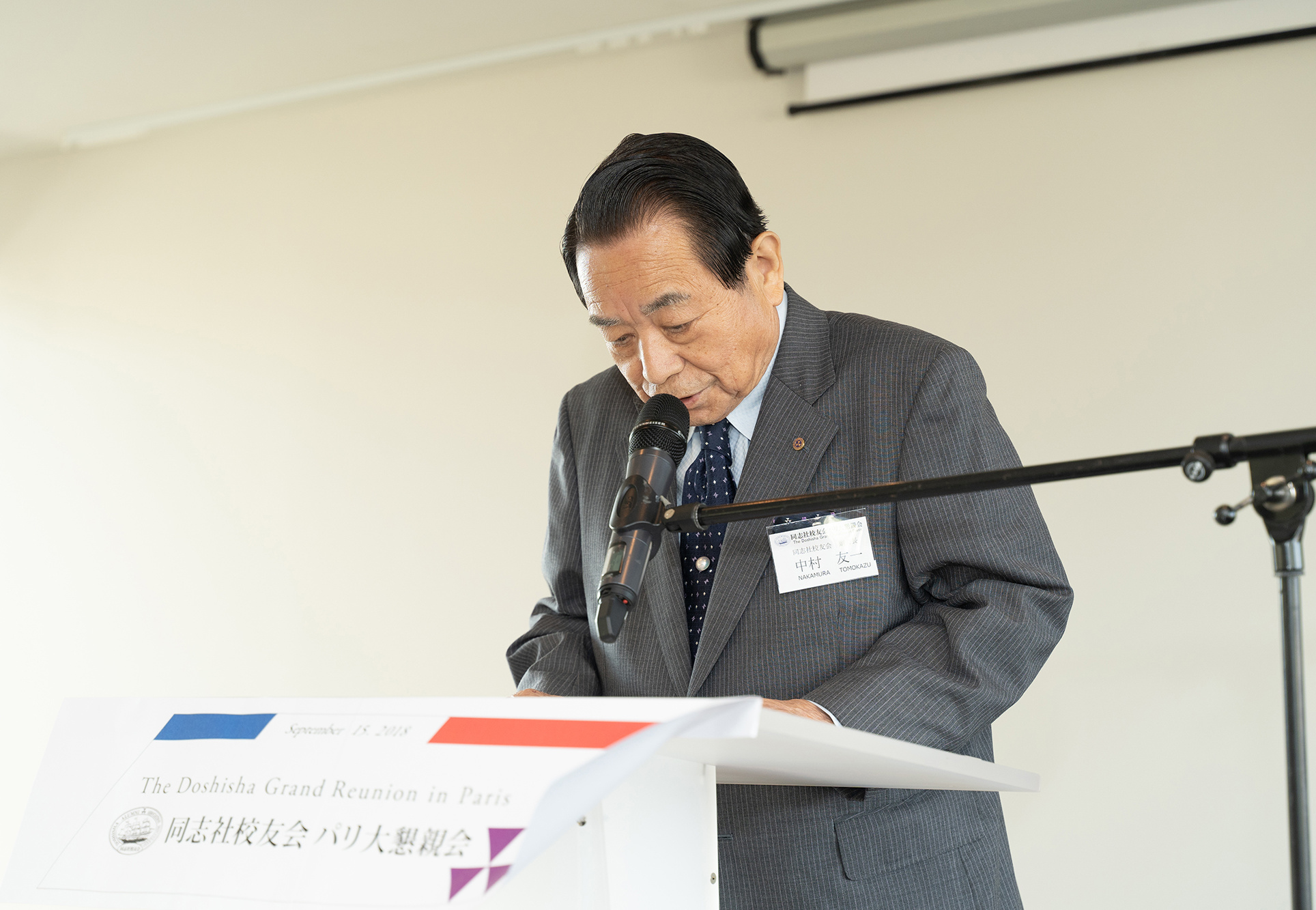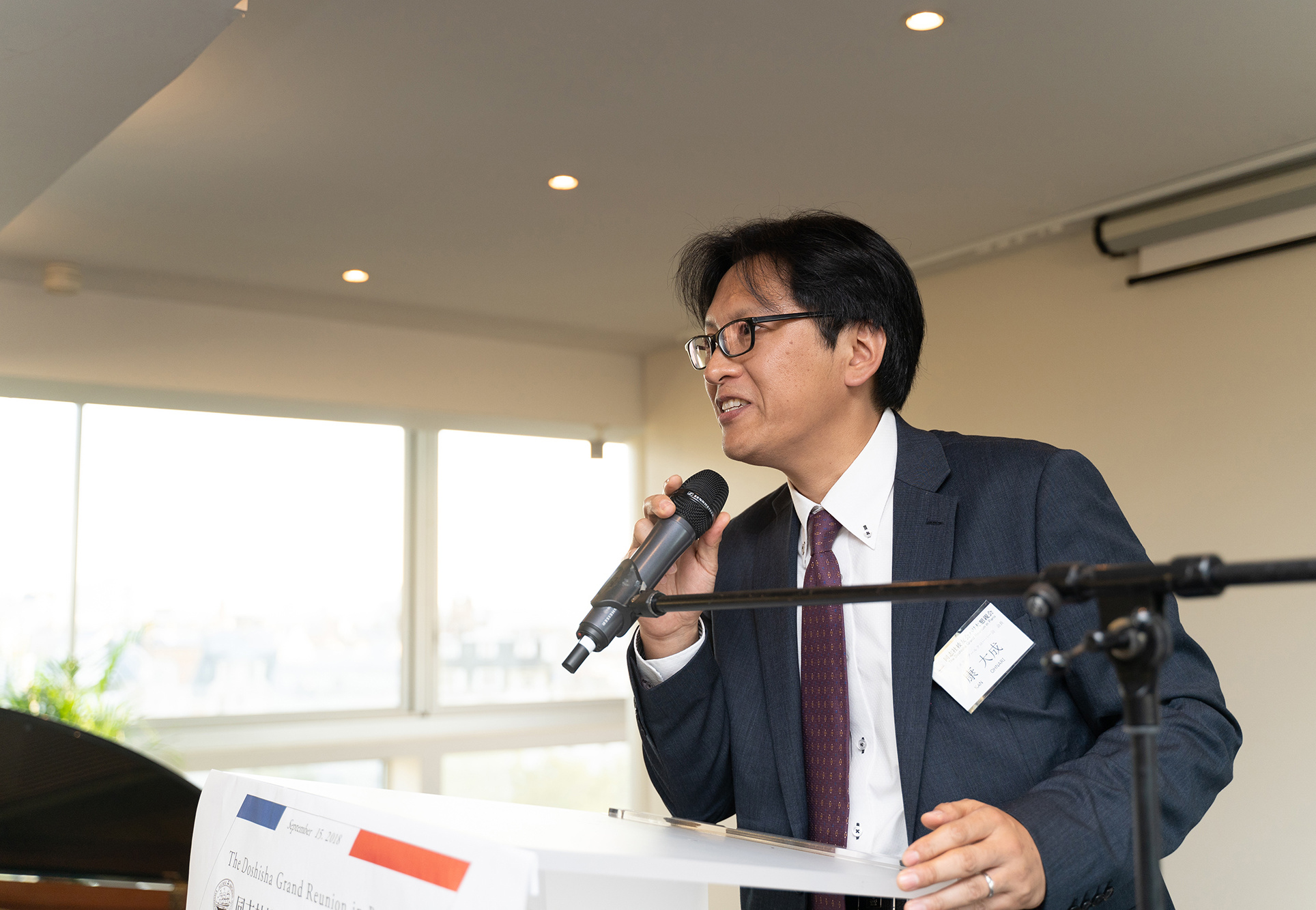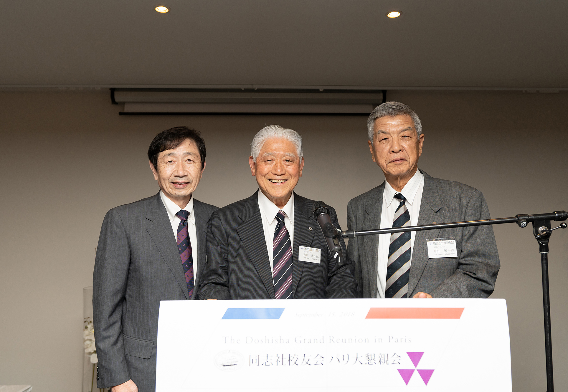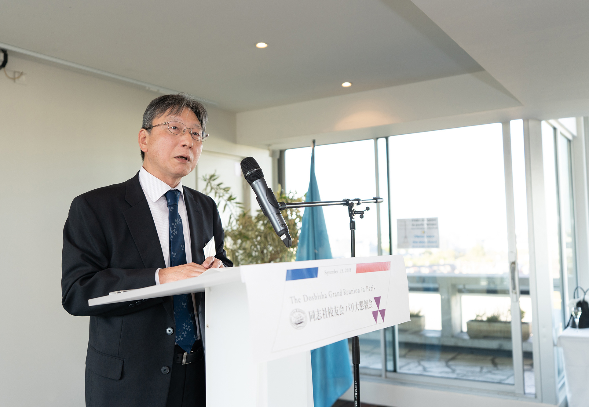 同志社校友会井上会長から、ここ数年の同志社校友会のグローバル化のスピードには目を見張るものがあり、ここパリはまさに同志社校友会グローバリゼーションの中核をなすものである。今後の校友会ネットワークの発展に向け、海外支部との連携を更に深めたいとご挨拶がありました。