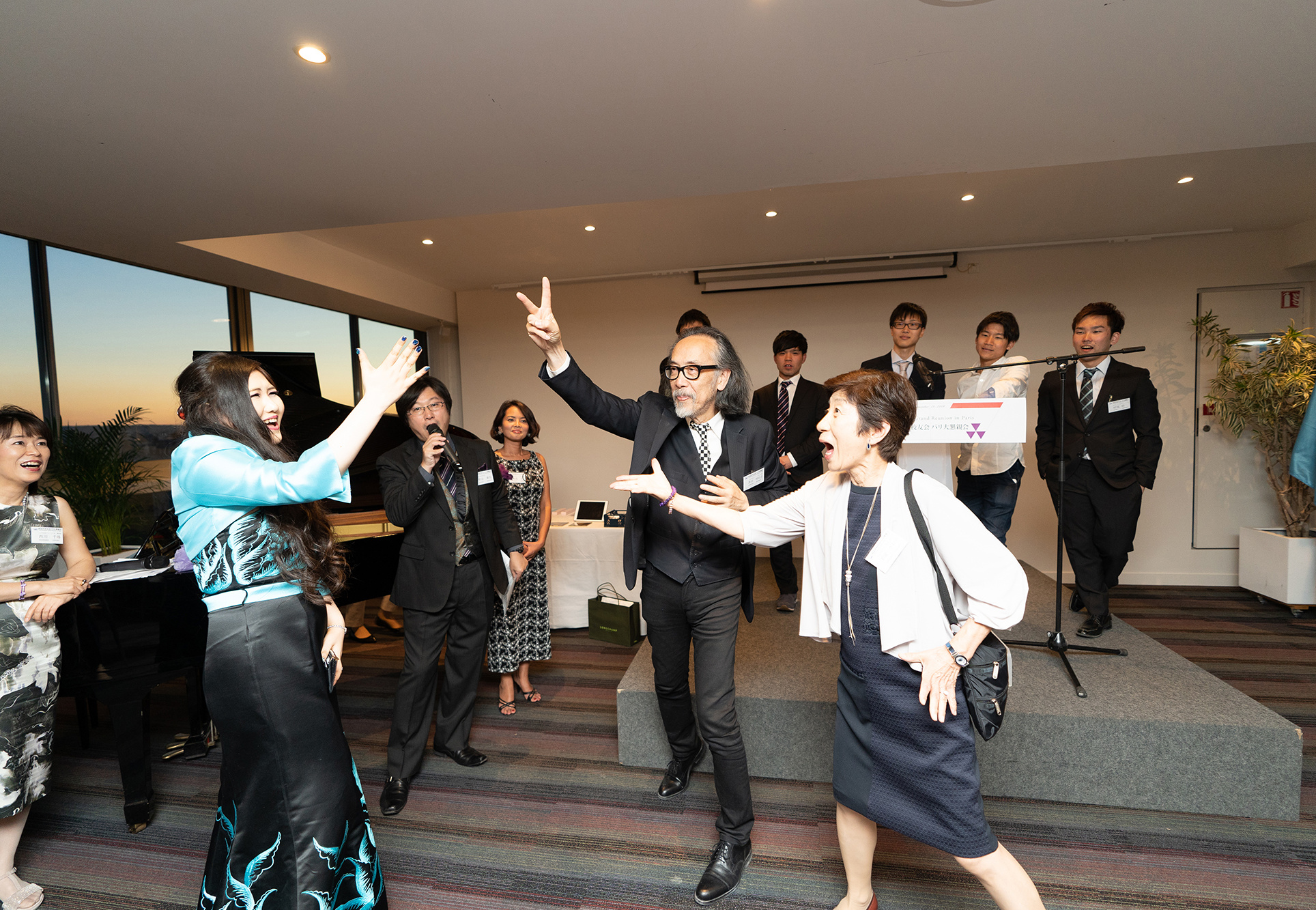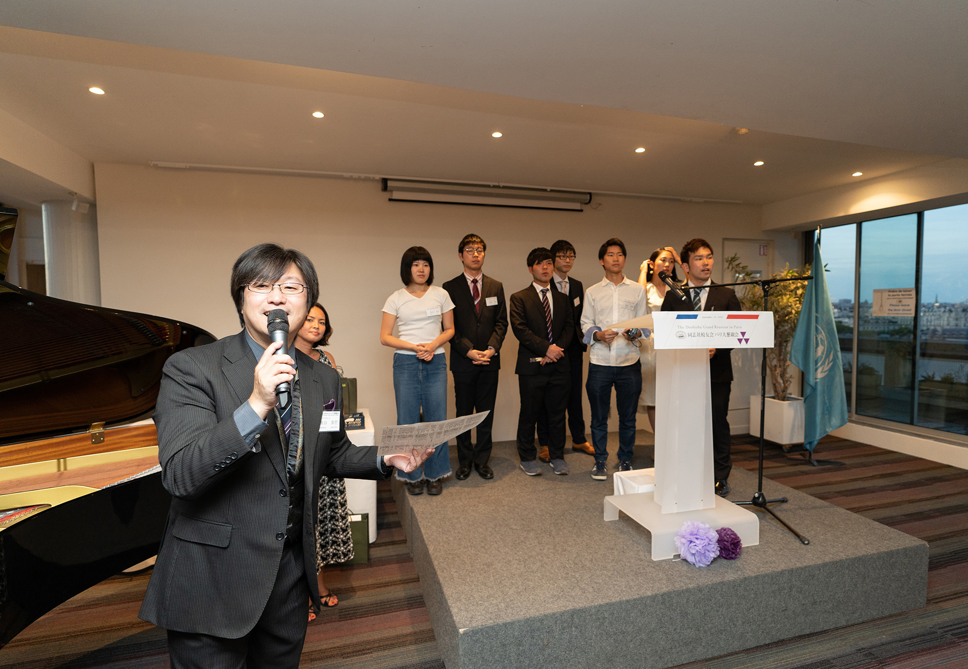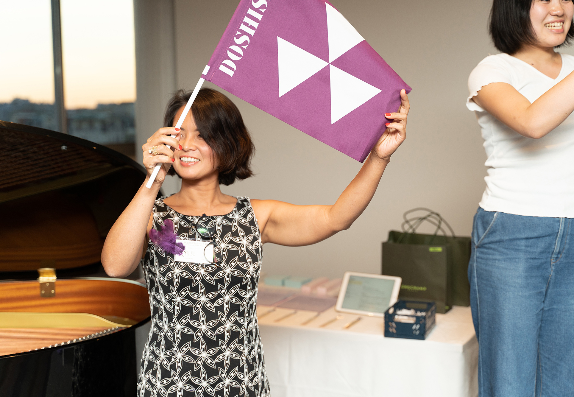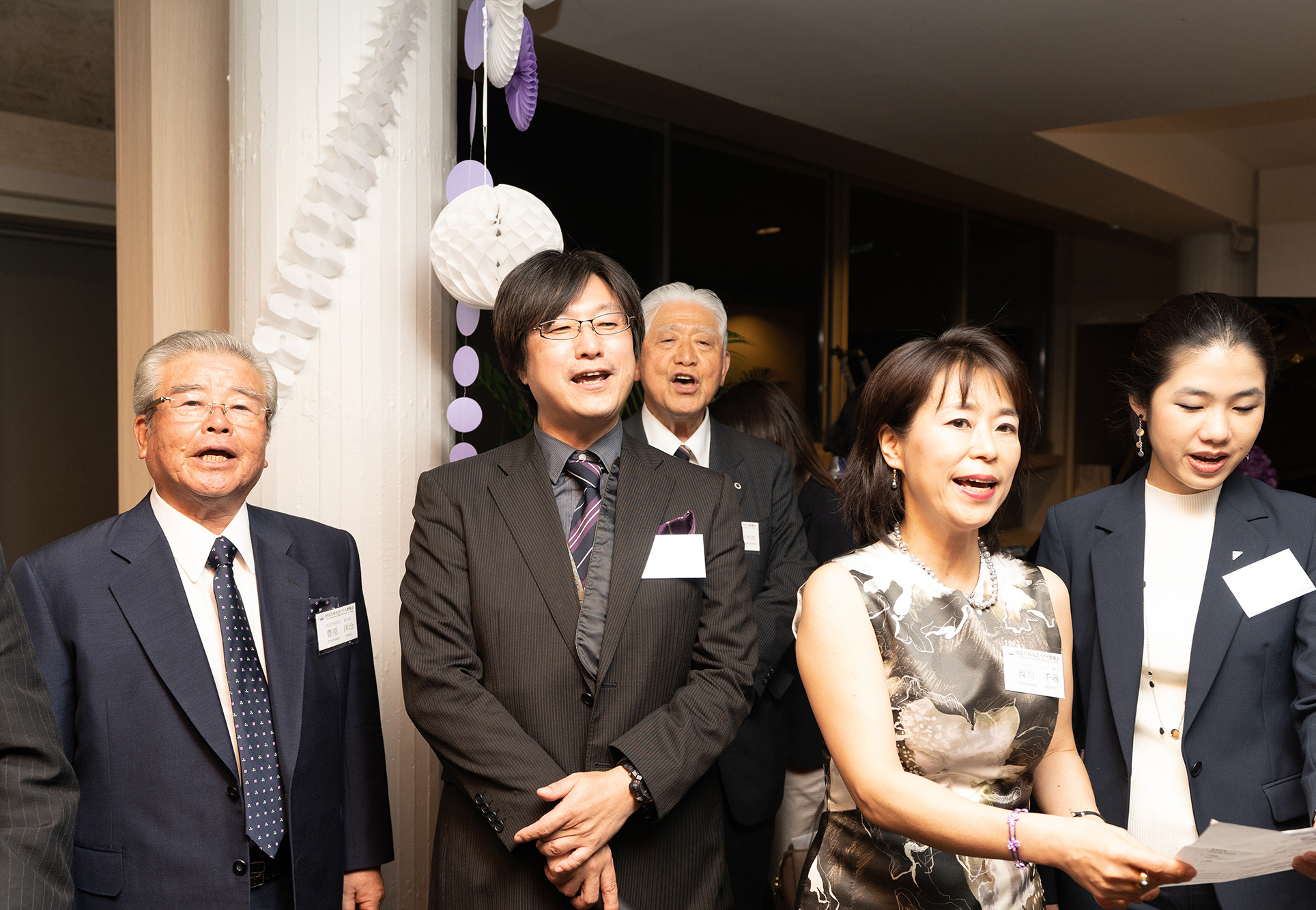 会の締めくくりは、パリ同志社クローバー会西川代表によるお礼の言葉、同志社校友会中村副会長によるご挨拶の後、懇親会でも素晴らしい演奏をご披露いただいた中本陽子さん、あべありかさんによるピアノ伴奏で「Doshisha College song」を参加者全員で高らかに歌い、「同志社チア」がパリの空の下こだましました。同志社の団結力と国際主義を再認識し、また何れかの国での再会を誓いながら名残惜しくもみな家路につき、パリの夜は更けていきました。