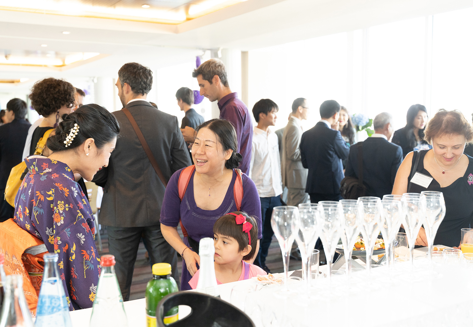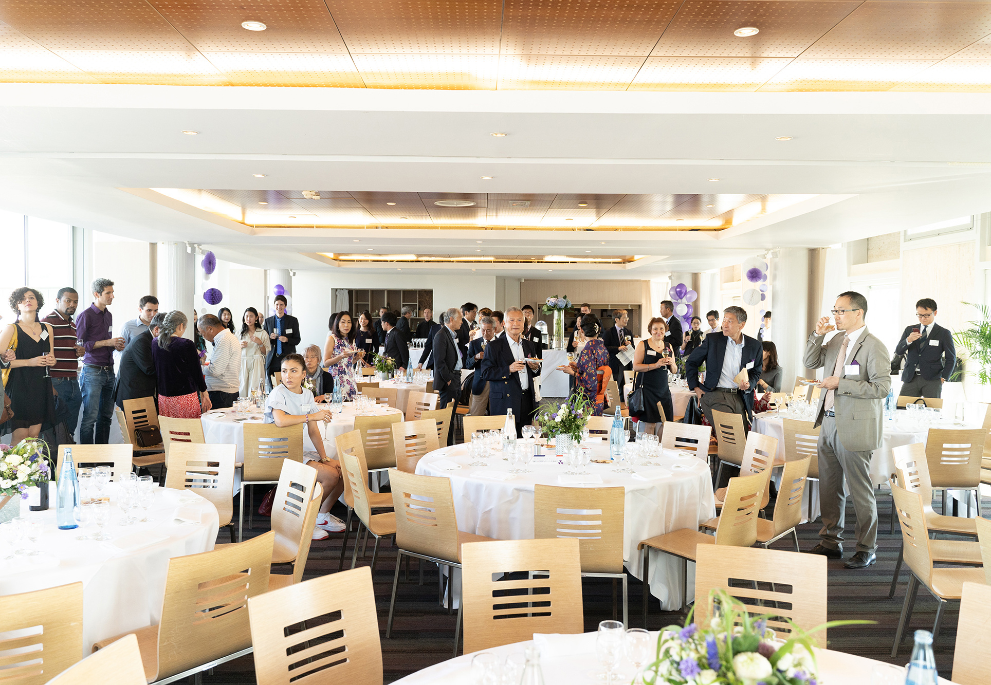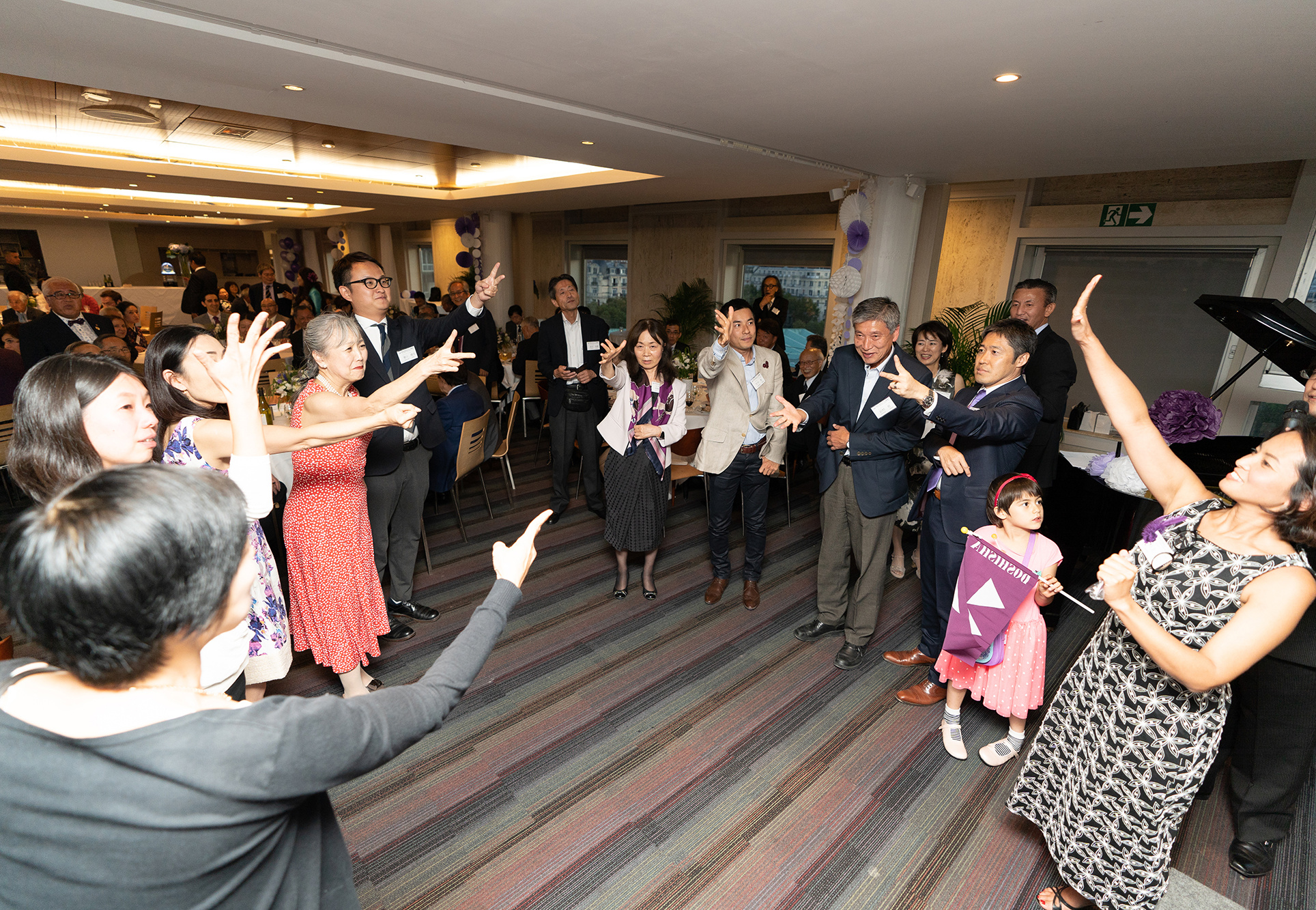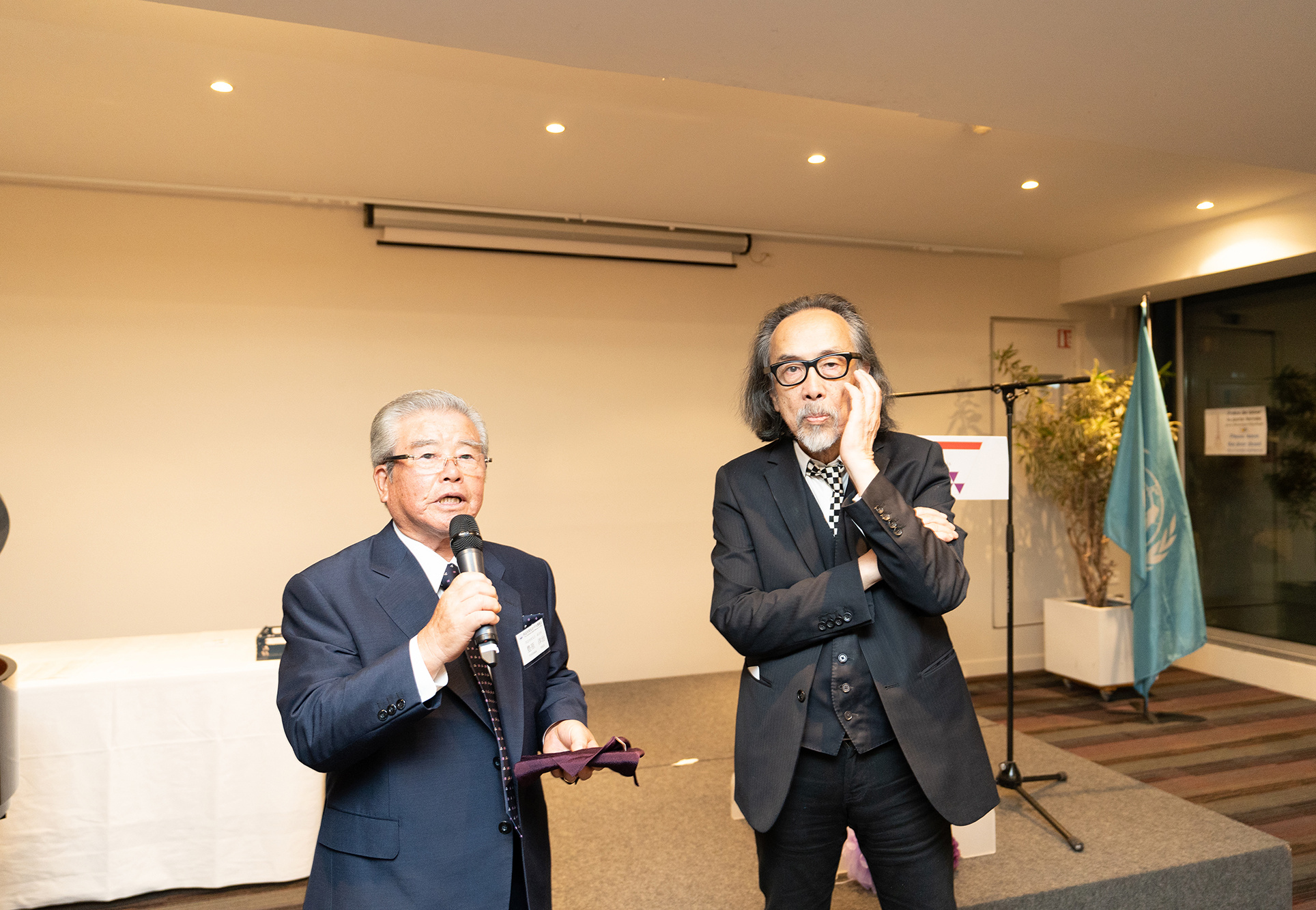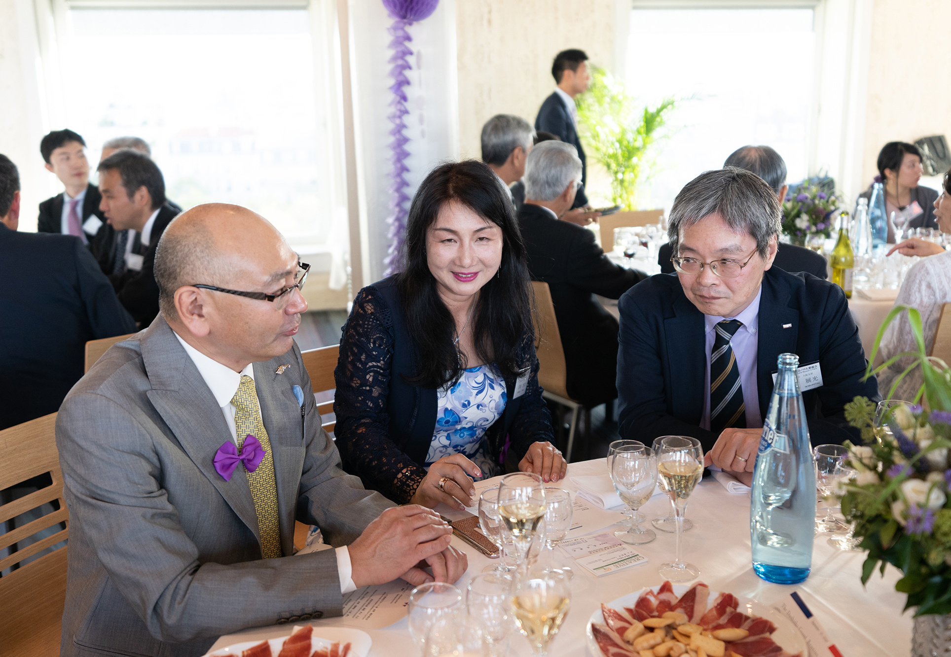 当日は偶然にも「ヨーロッパ文化遺産の日」と重なり、会場となったパリのユネスコビルにも大勢の観光客が訪れる中、パリはもちろん、ロンドン、スペイン、フィレンツェ、ミラノ、ドイツ、イスタンブールのヨーロッパ各支部、トロント、米国西部、及び中西部支部の参加となりました。また、日本からも多くの方々がユネスコビル7階レストランに集い、総勢107名の方が参加されました。