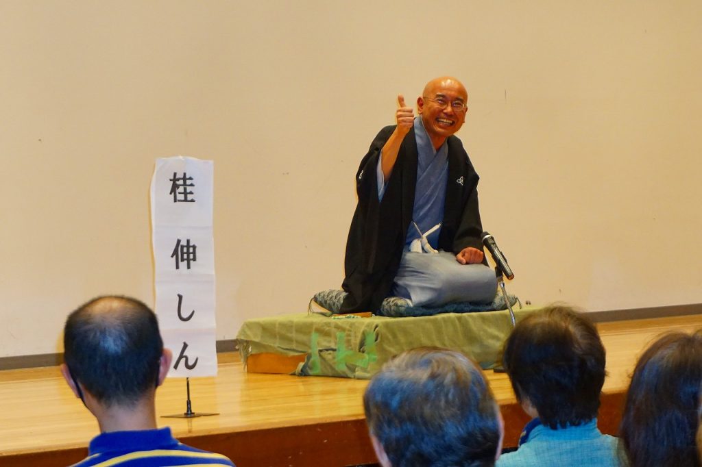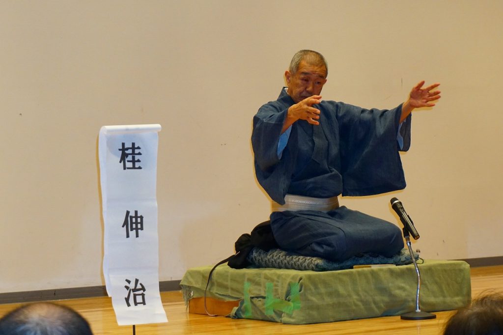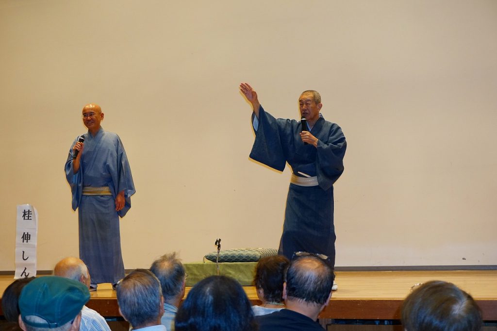 お彼岸も過ぎたこの日、猛暑からは、朝晩はやや涼しくなったとはいえ、夏日に近い暑さの中、一般客を含め100名以上のお客さんがお見えになり盛大に開催されました。出演者は昨年同様、桂一門を率いる、「桂伸治師匠」とお弟子さんの「桂伸しん」さん。出し物は伸治師匠が「粗忽の釘」と「鰻のたいこ」、伸しんさんは「真田小僧」と「熊の皮」。師匠の出し物は地方ではほとんど演じない出し物で、新宿末広亭の雰囲気を静岡で演じていただきました。
