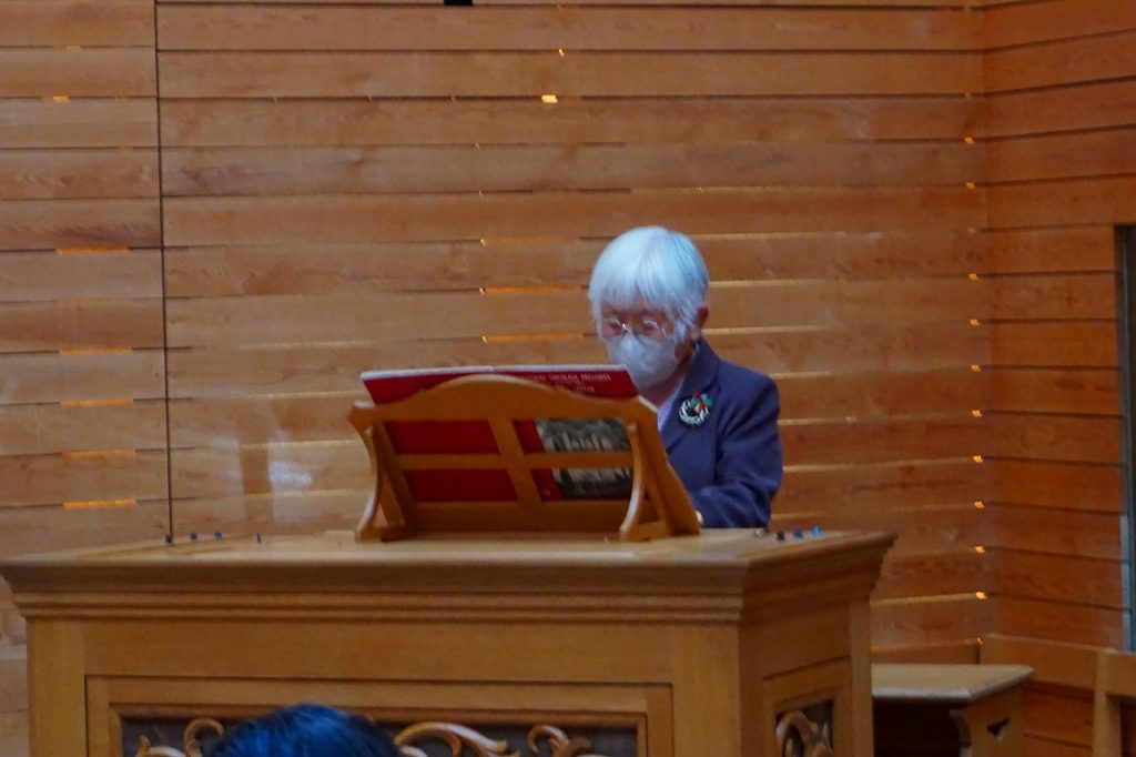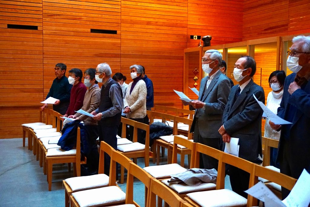 一昨年、昨年と好評だった英和女学院高等部の生徒さんの参加はスケジュールが合わず不参加だったのは大変残念でしたが、同志社関係者20名、一般参加者10名が集まり、厳かな雰囲気の中、中村牧師の主導で式は始まりました。